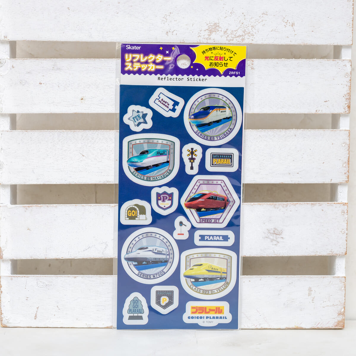 1959年に誕生した、3世代にわたって愛されているロングセラーの鉄道玩具ブランド「プラレール」デザインのリフレクターステッカー。