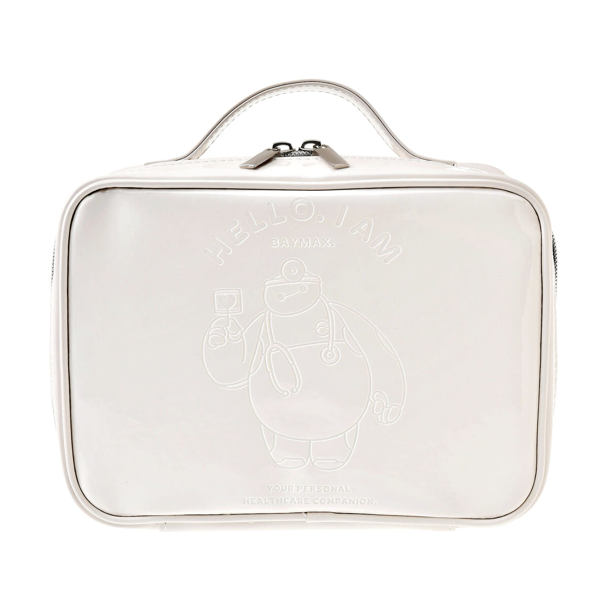 ドクター風「ベイマックス」とロゴがエンボス加工で施された、つるんとした生地の光沢がある持ち手付きの大容量ポーチ。
