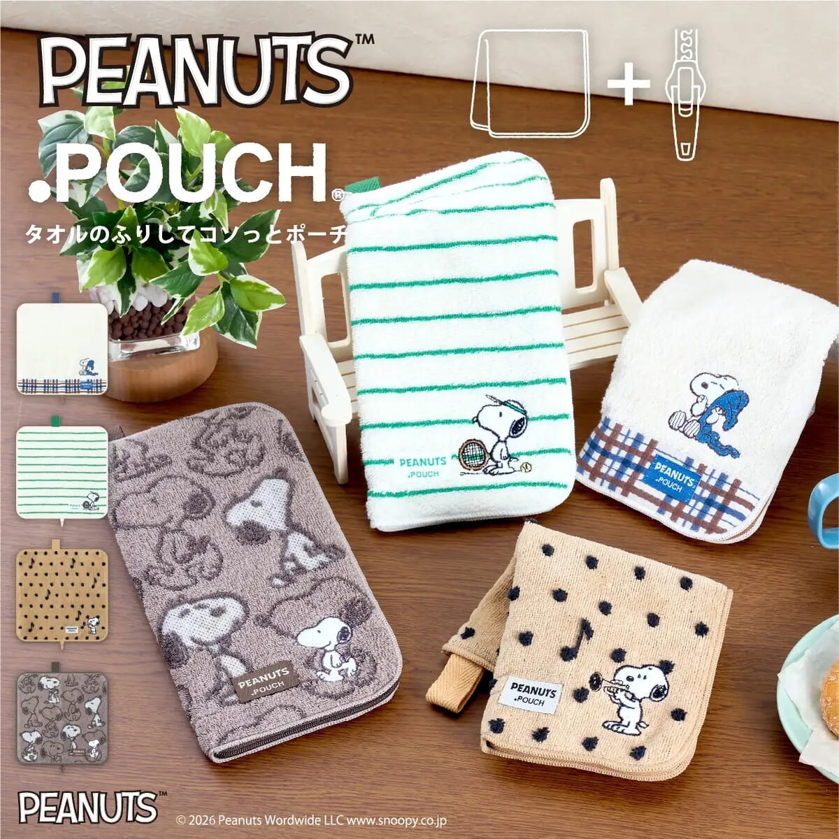 タオルのふりしてコソッとポーチでおなじみ、アイアップの「どっとポーチ(.POUCH)」に、新しい「スヌーピー」デザイン6種が新たに仲間入り。