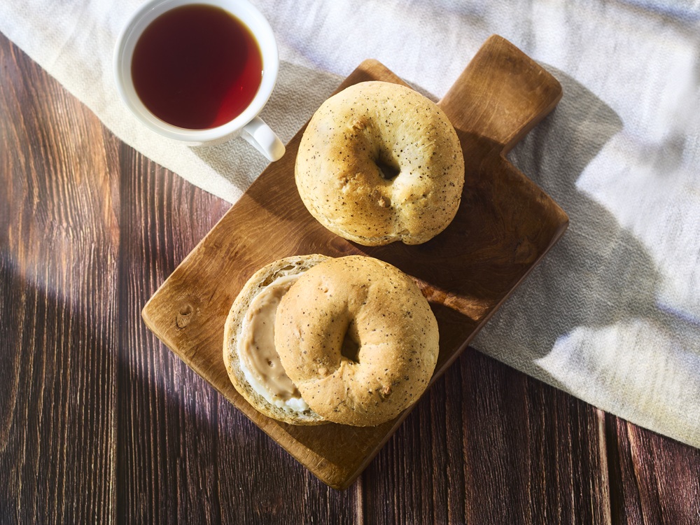 アールグレイの茶葉を生地に練り込み、ミルクと紅茶の2種のクリームをもちもち食感のベーグルに挟んだ「ベーグルサンド アールグレイミルクティー」
