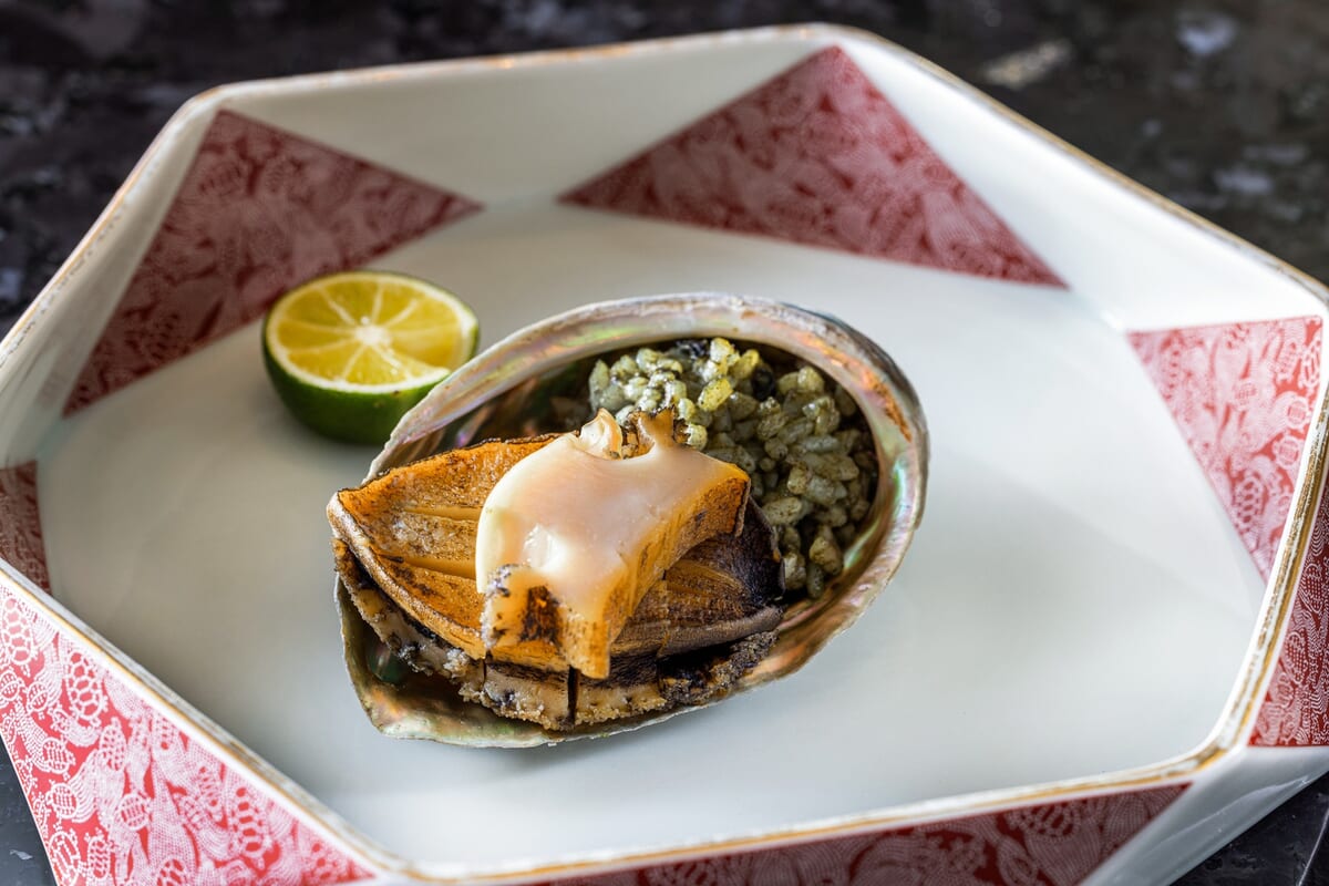 鮑は鉄板で丁寧に焼き上げ、身はしっかりと弾力を残しつつ肝の旨味が添えられ、贅沢な美味しさです。