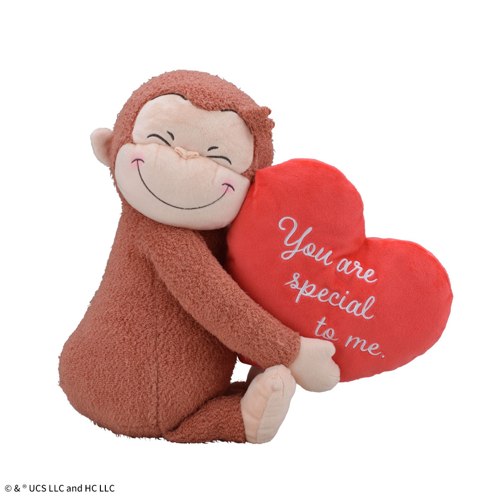 「おさるのジョージ」85周年を記念した、「85th」のハートを抱えたマスコット。