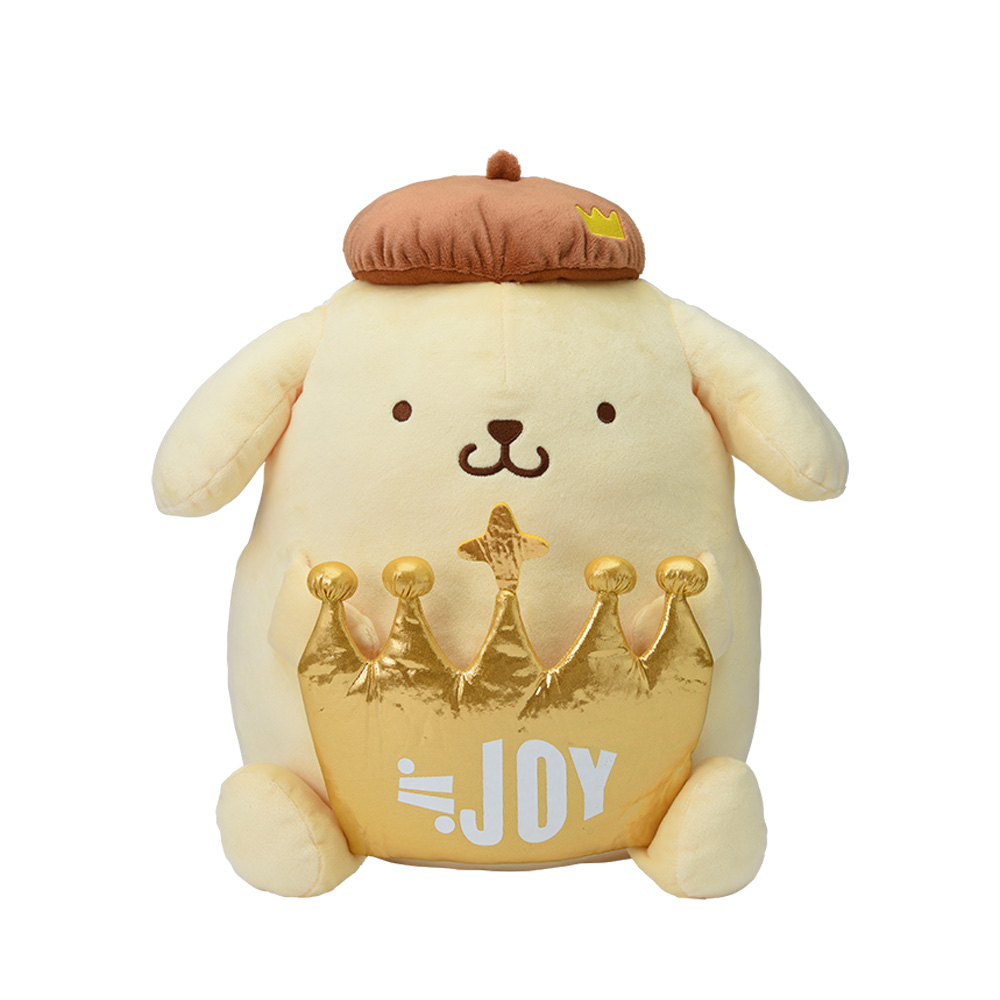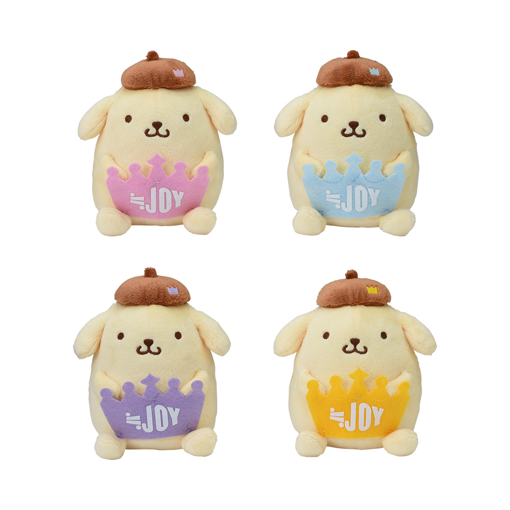 王冠マークが入ったベレー帽を被り、「≒JOY」のロゴマークを手にした「ポムポムプリン」のマスコットとぬいぐるみが展開されます☆