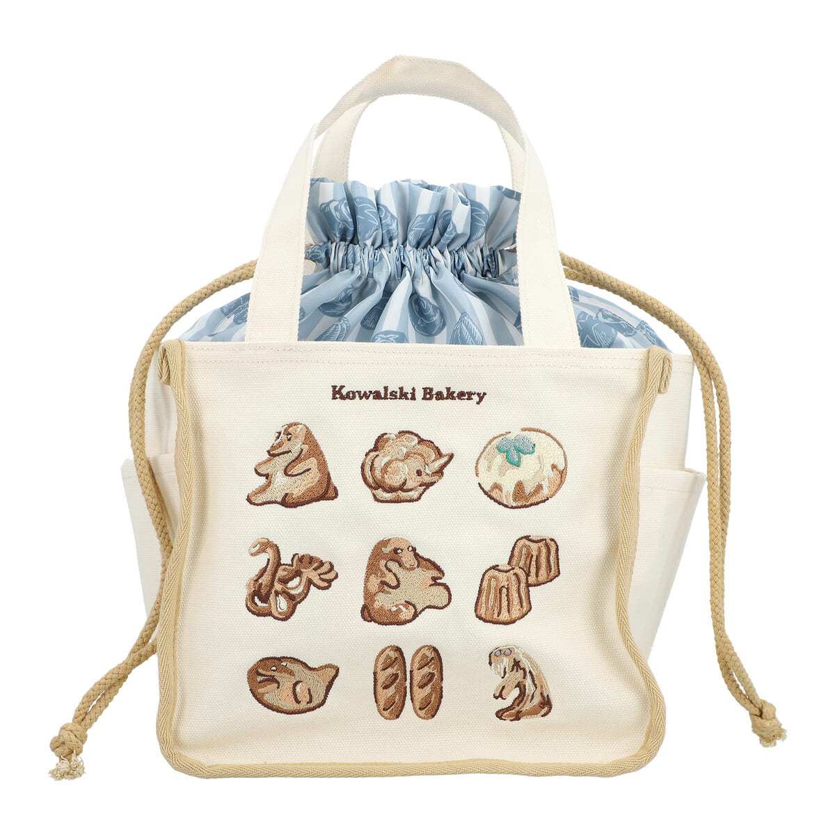 内布にパンの総柄を使用した、巾着タイプのトートバッグです。