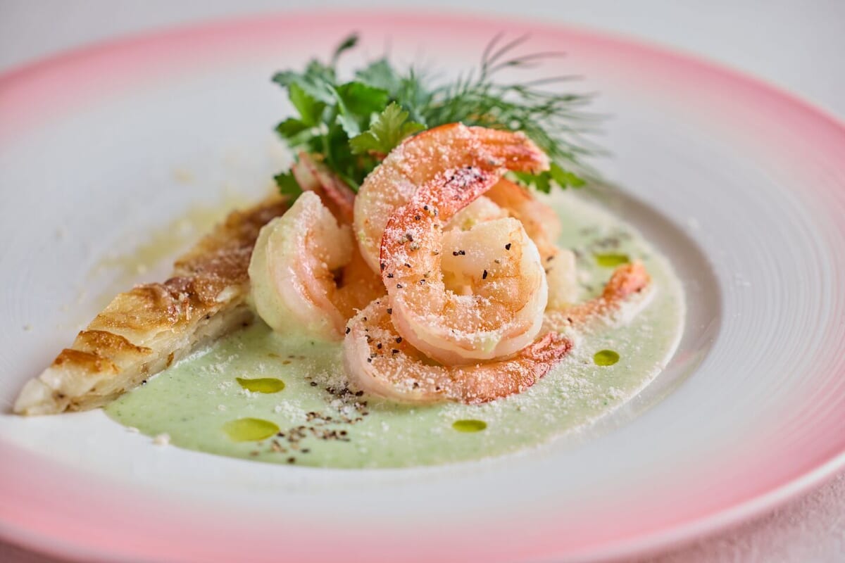 シェフが目の前で仕上げるライブキッチンでは、ランチとディナーそれぞれで異なる海老料理をラインナップ。