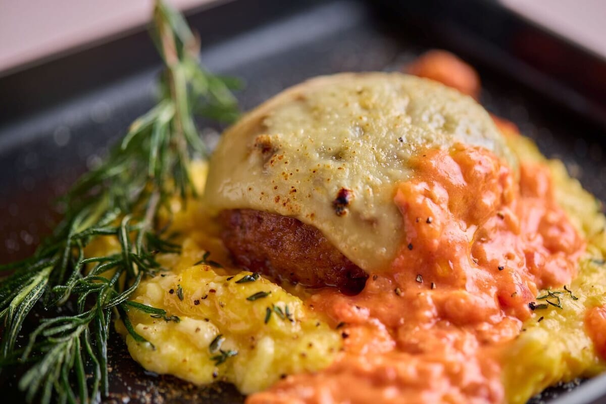 ゴーダチーズのコク、トマトソースの酸味、ふんわりとしたスクランブルエッグを混ぜながら楽しむ、カシュカシュならではの一品です。