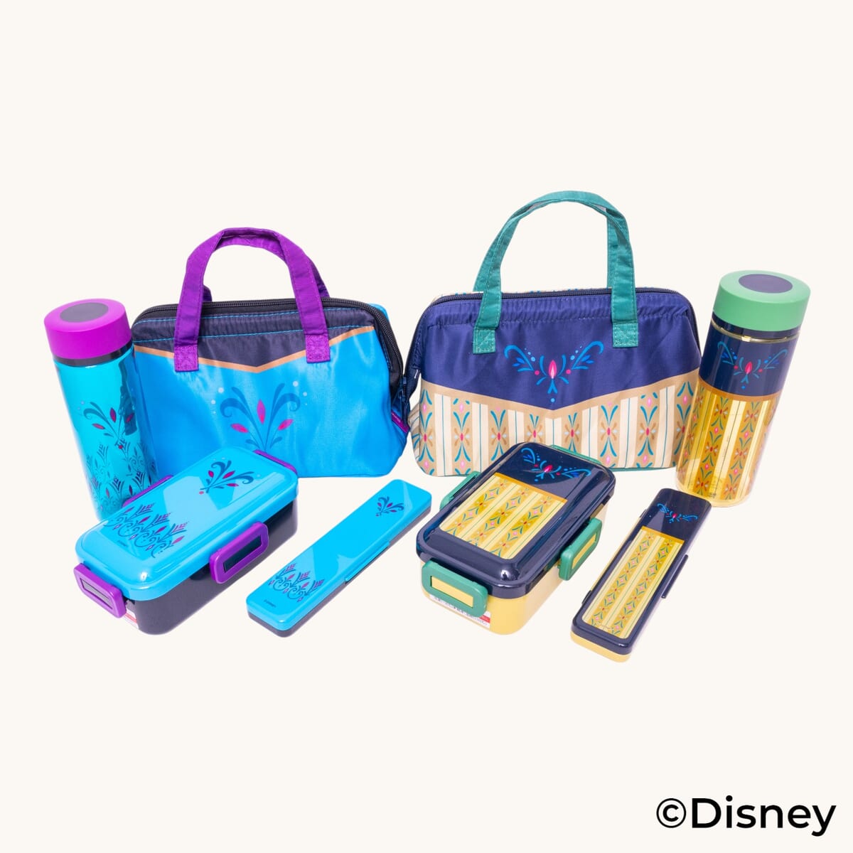 世代を超えて愛される『アナと雪の女王』の「アナ」と「エルサ」の美しいドレスの象徴的なモチーフとカラーリングのランチグッズは、機能性もあり、大人も子どもも満足できるラインアップとなっています。