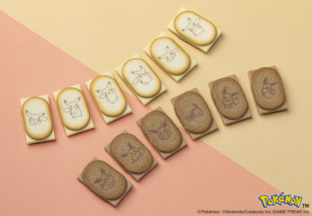 バナナヨーグルトチョコレートをサンドしたクッキーにはピカチュウの絵柄を、キャラメルマキアートチョコレートをサンドしたクッキーにはイーブイの絵柄がそれぞれ描かれています。