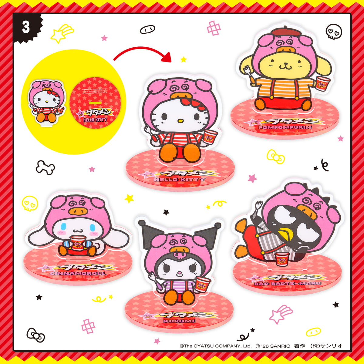 サンリオの人気キャラクター「ハローキティ」「ポムポムプリン」「シナモロール」「クロミ」「バッドばつ丸」たちがブタメンくんになりきった、楽しいオリジナルデザイン全18種が発売されます。