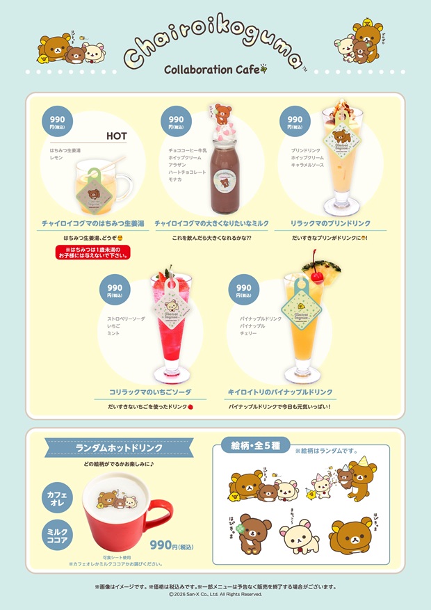 「チャイロイコグマ」をはじめ「リラックマ」や「コリラックマ」「キイロイトリ」をイメージした、オリジナルメニューが提供されます。