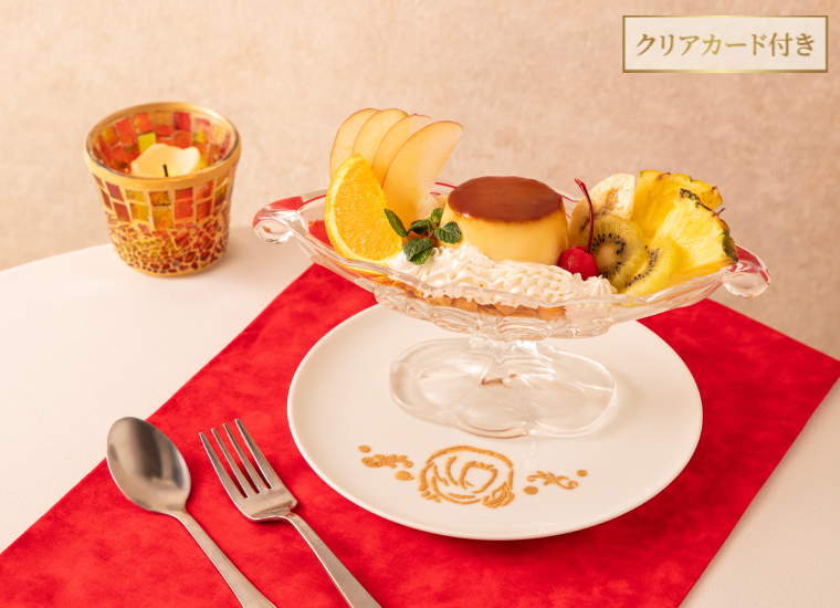 天使の羽をイメージして、プリンにフルーツやアイスを添えたプディング・ア・ラ・モード。