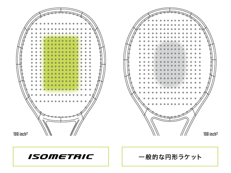 - スウィートエリア:一般的な円形ラケット比で上下左右に7%拡大