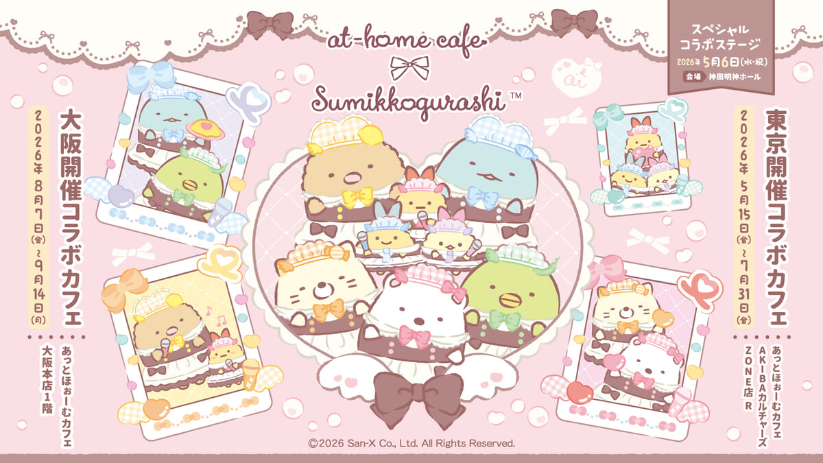 サンエックスの「すみっコぐらし×あっとほぉーむカフェ」コラボカフェは、2026年5月15日~7月31日まで東京・秋葉原で、2026年8月7日~9月14日まで大阪で開催します!