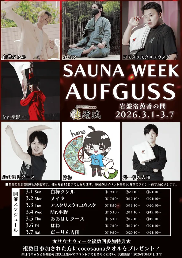 岩盤浴蒸香の間では日替わりで熱波師が登場し、3月1日から7日まで毎日3回のアウフグースを実施します。