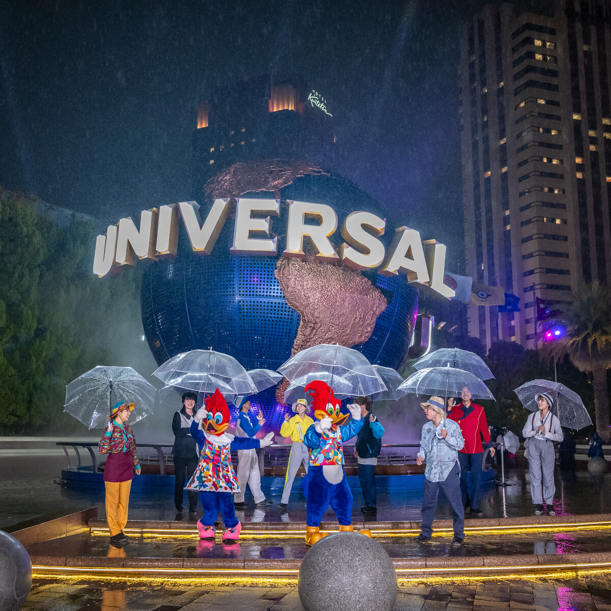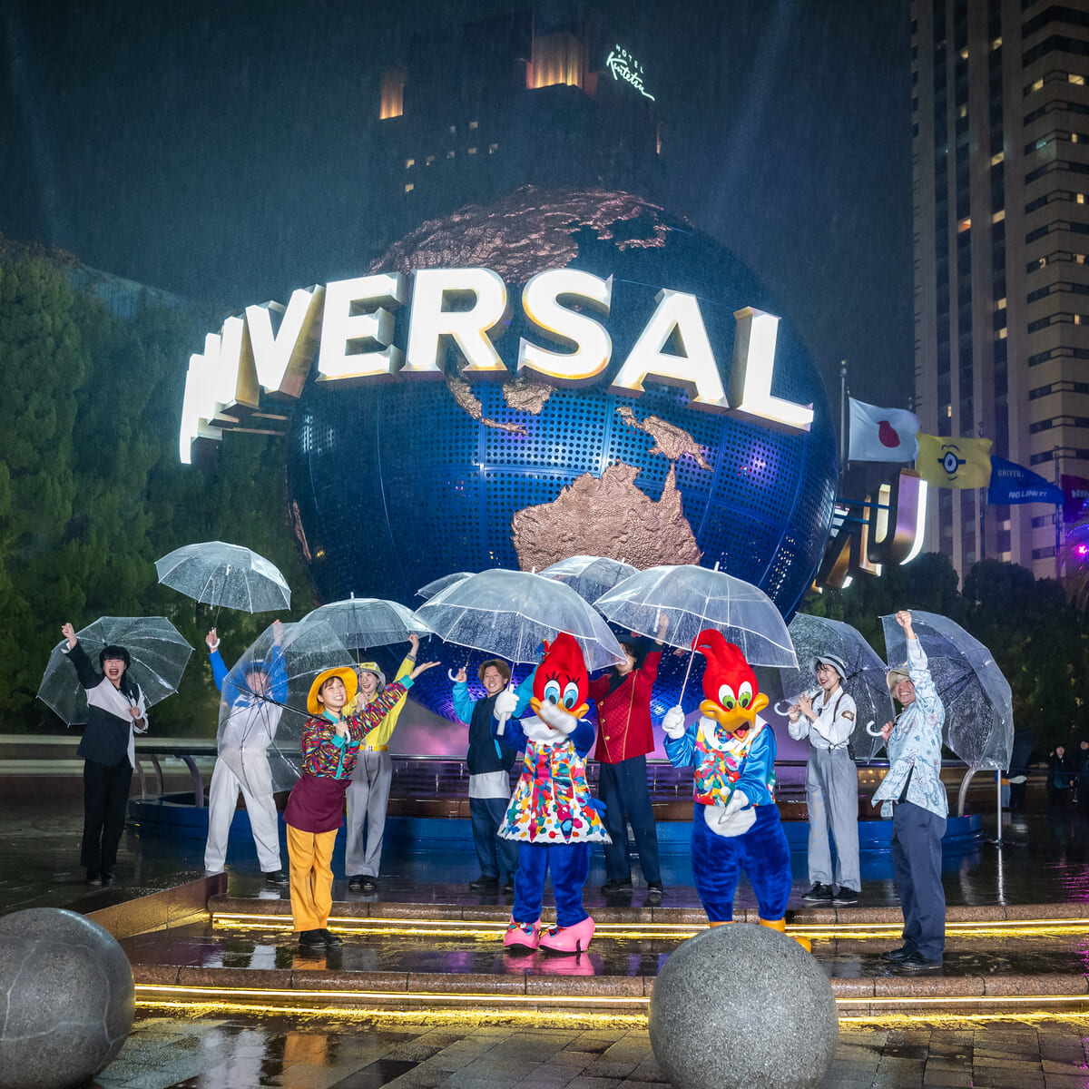 25年間、多くのゲストをお迎えしてきたパークの象徴「ユニバーサル・グローブ」の前に、ウッディー・ウッドペッカーとウィニー・ウッドペッカー、そしてクルーが登場しました。