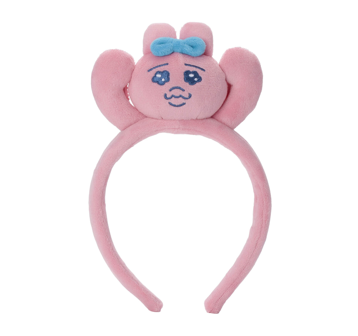 両手を上げる「おぱんちゅうさぎ」のぬいぐるみをのせたカチューシャ。