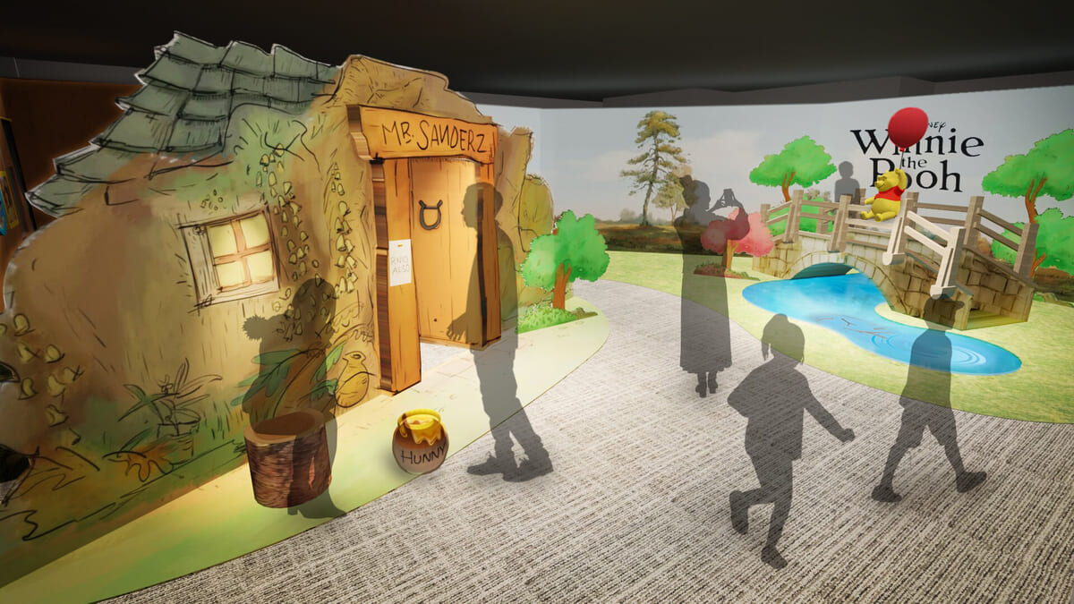 100エーカーの森を再現したエリアでは、アニメーションの貴重なコンセプトアートを展示するほか、様々なフォトブースを設置しており、100年の歴史を五感で楽しめる没入型の展示を展開。