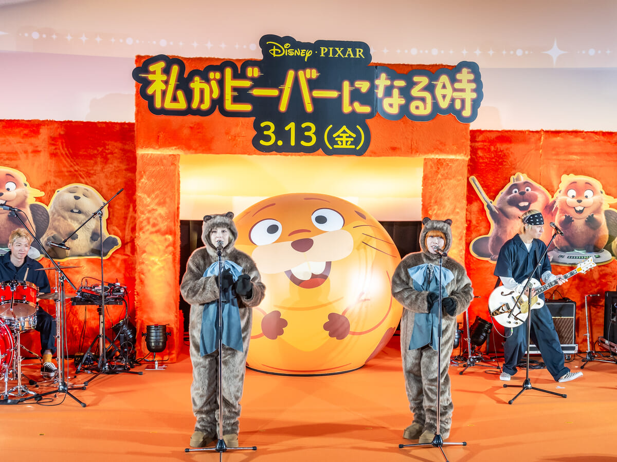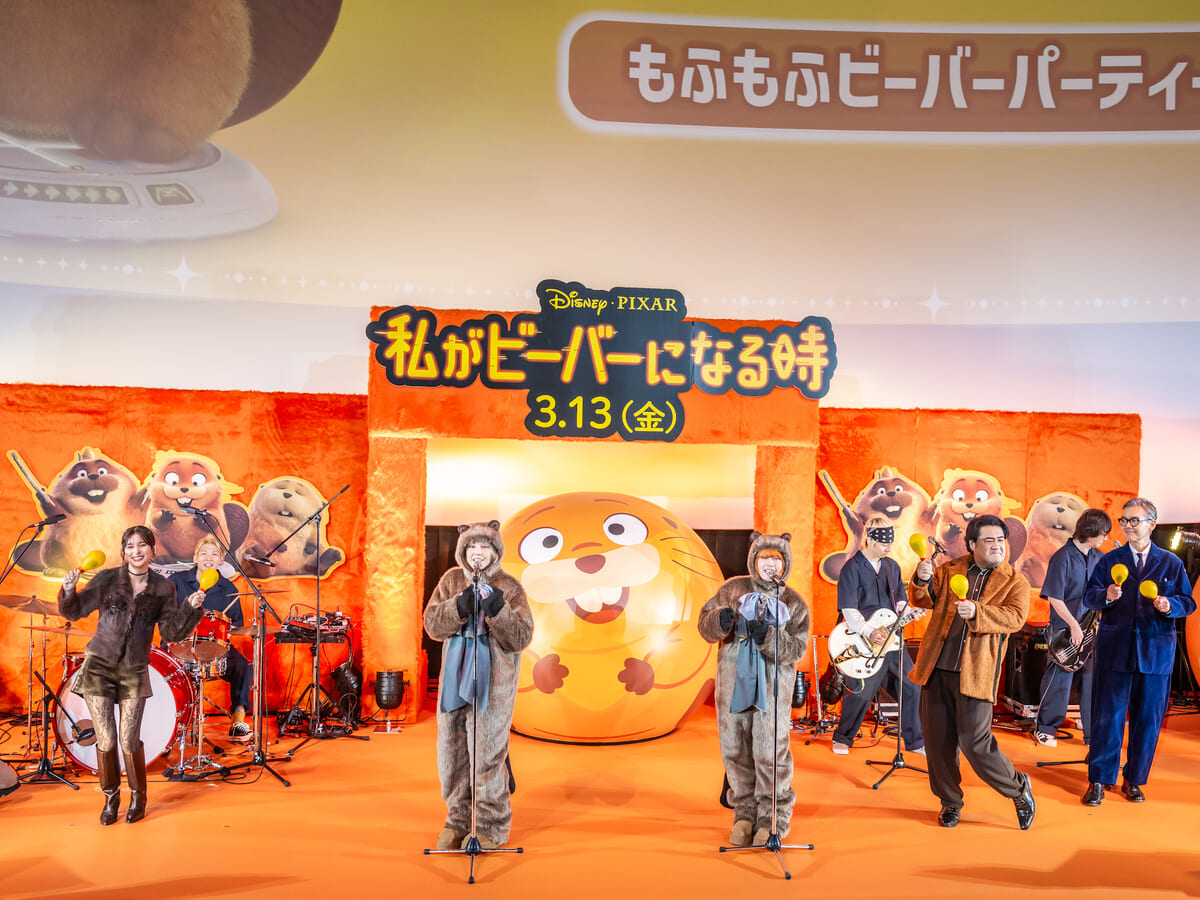 イベントでは、日本版エンドソングを担当するPUFFYのお二人が、なんと劇中のビーバーをイメージした着ぐるみ姿でステージに登場!