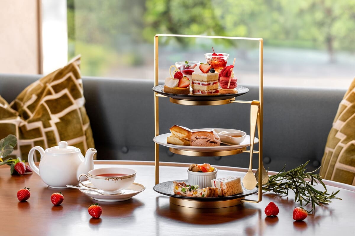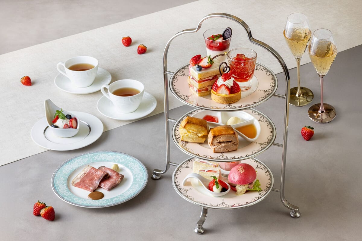 格調高いティースタンドには、旬の苺を贅沢に使用した華やかなスイーツと、ホテルメイドの精巧なセイボリーを美しくセット。