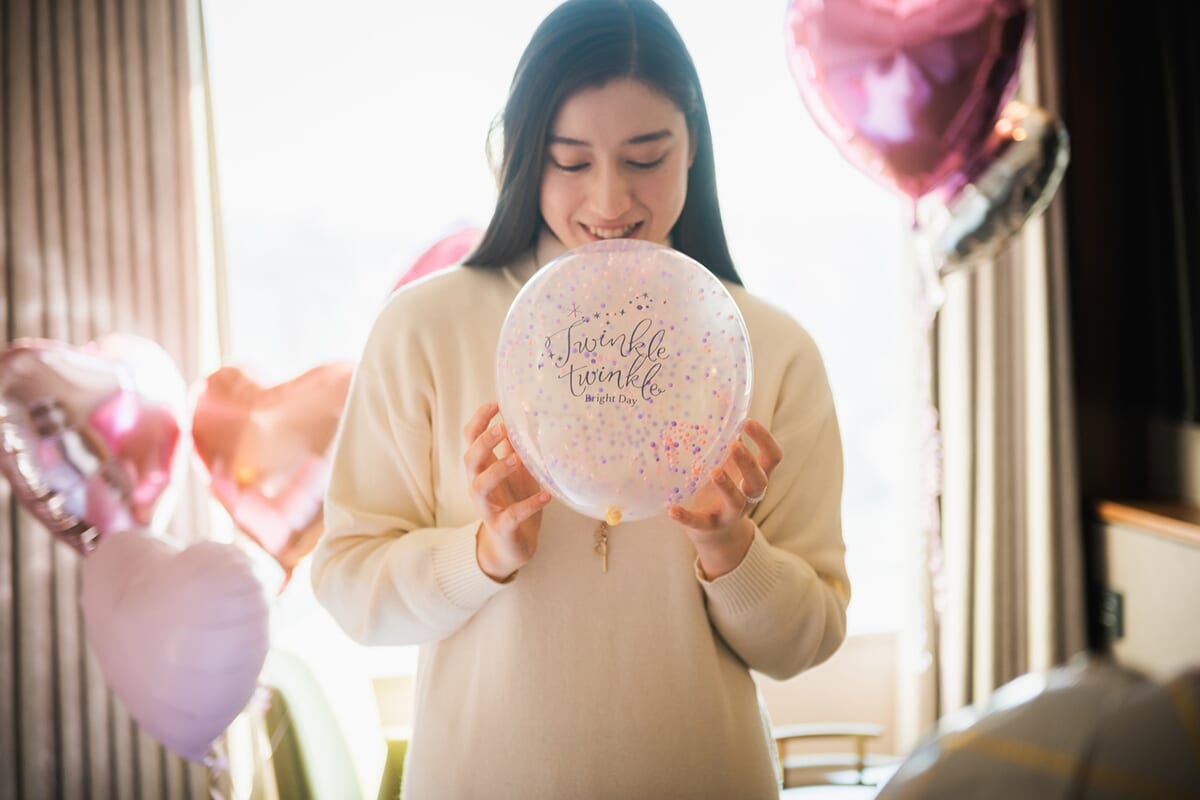 ベッドサイドやベッド上を彩るバルーンは、ピンク・ゴールド・ブルーなど、好みのカラーを選べます。