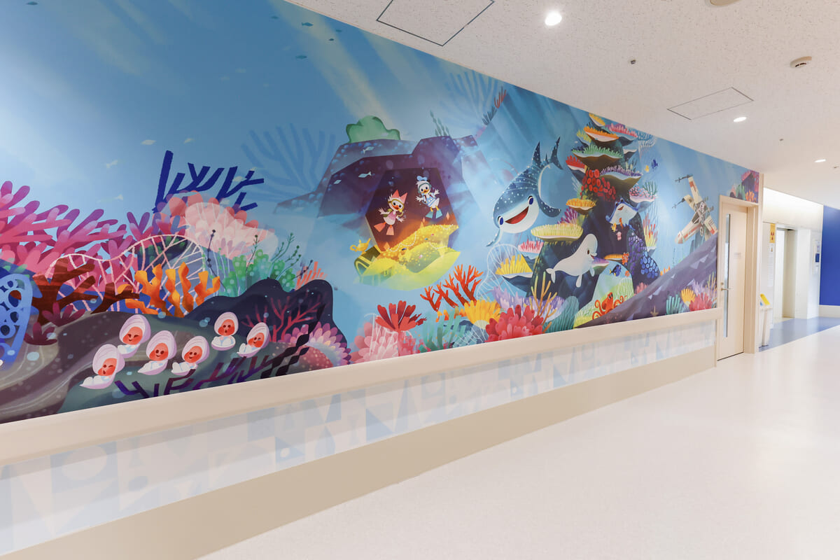 治療への不安を和らげるために整えられた空間では、エレベーターに乗る瞬間からディズニーの物語の世界が始まり、導線に沿ってカラフルなディズニーキャラクターたちが迎えてくれます。