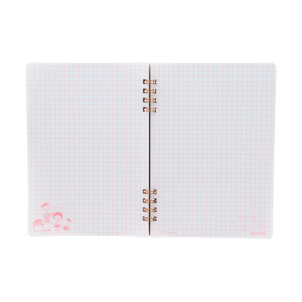 本文に「花輪クン」と同じヘアスタイルの「タキシードサム」と、「ハローキティ」とお揃いのリボンをつけた「まる子」がプリントされた、方眼タイプのノートです。