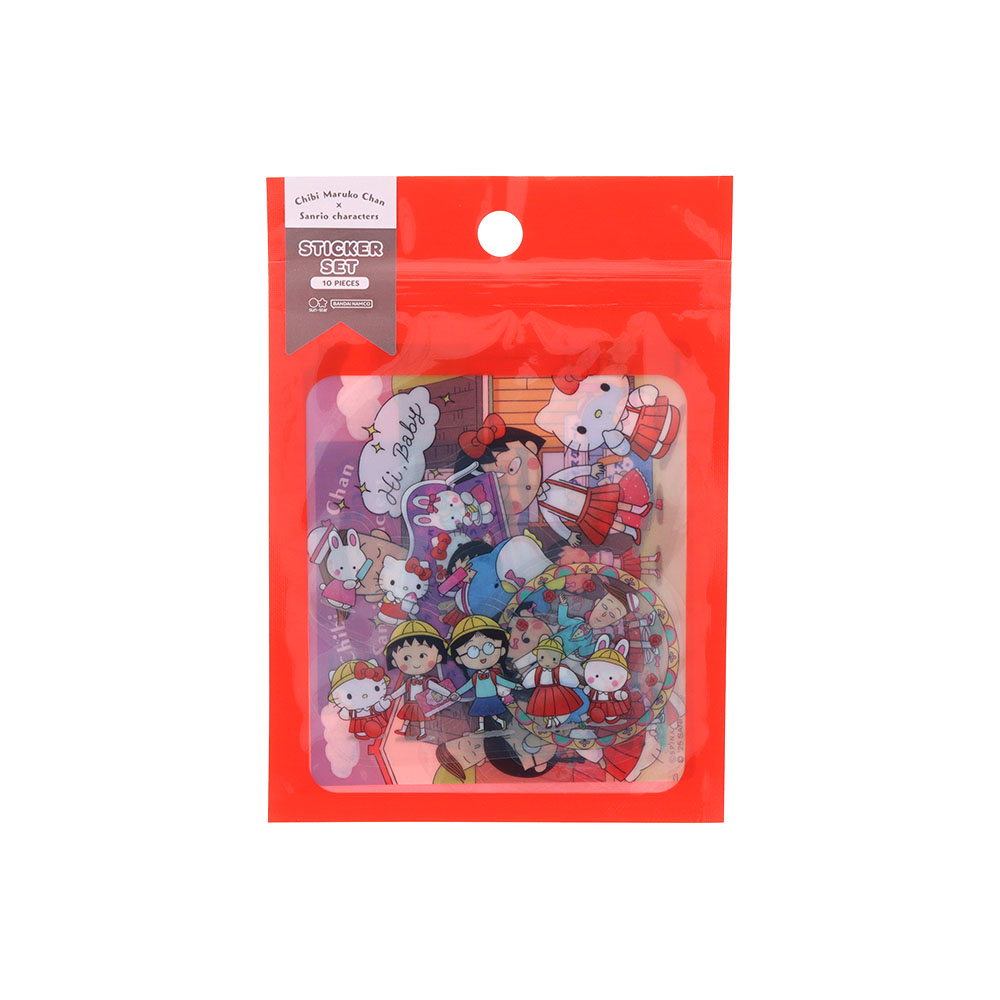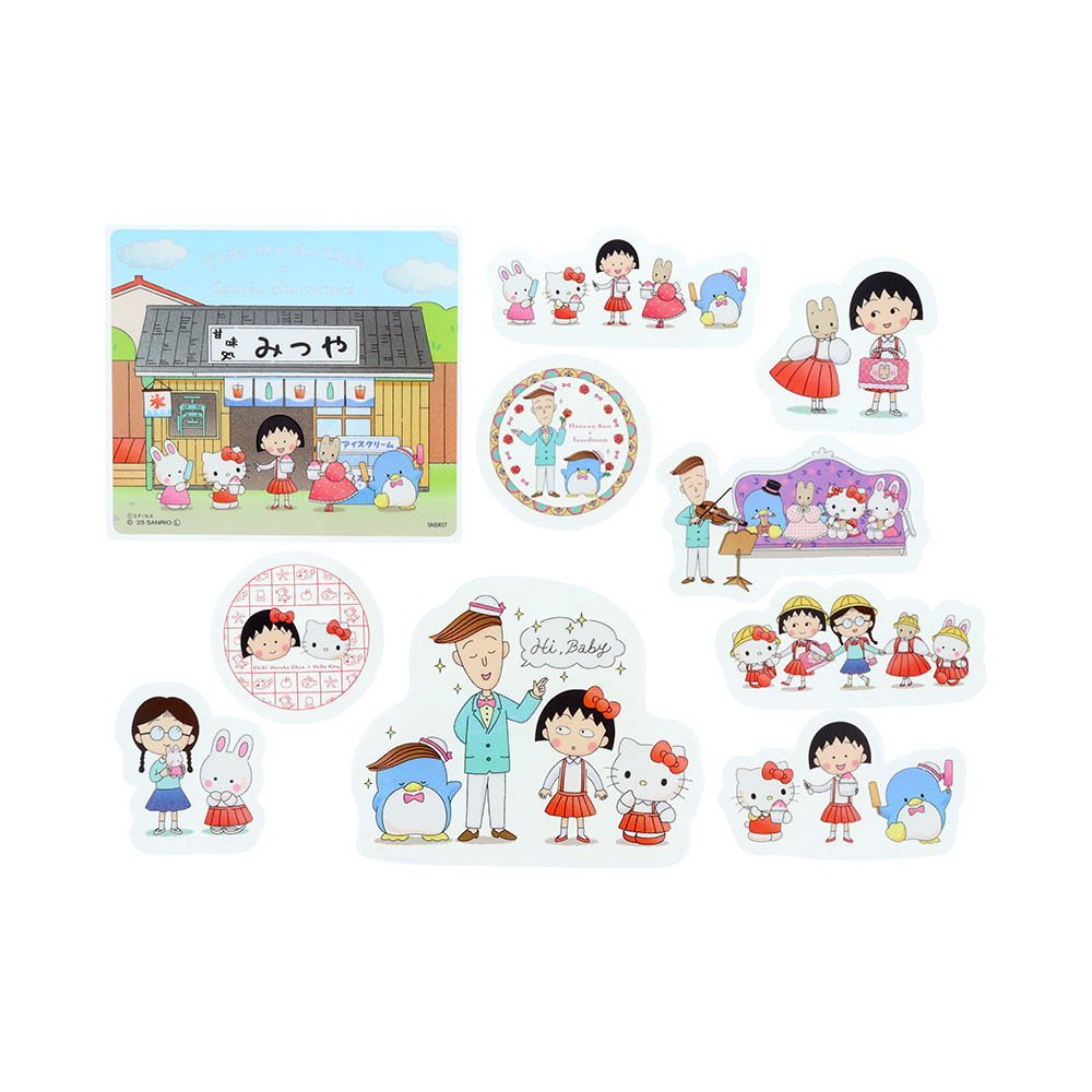 髪をなびかせながら同じポーズをとる「花輪クン」と「タキシードサム」や、お顔のアップをデザインした「まる子」と「ハローキティ」のステッカーなどが入っています。