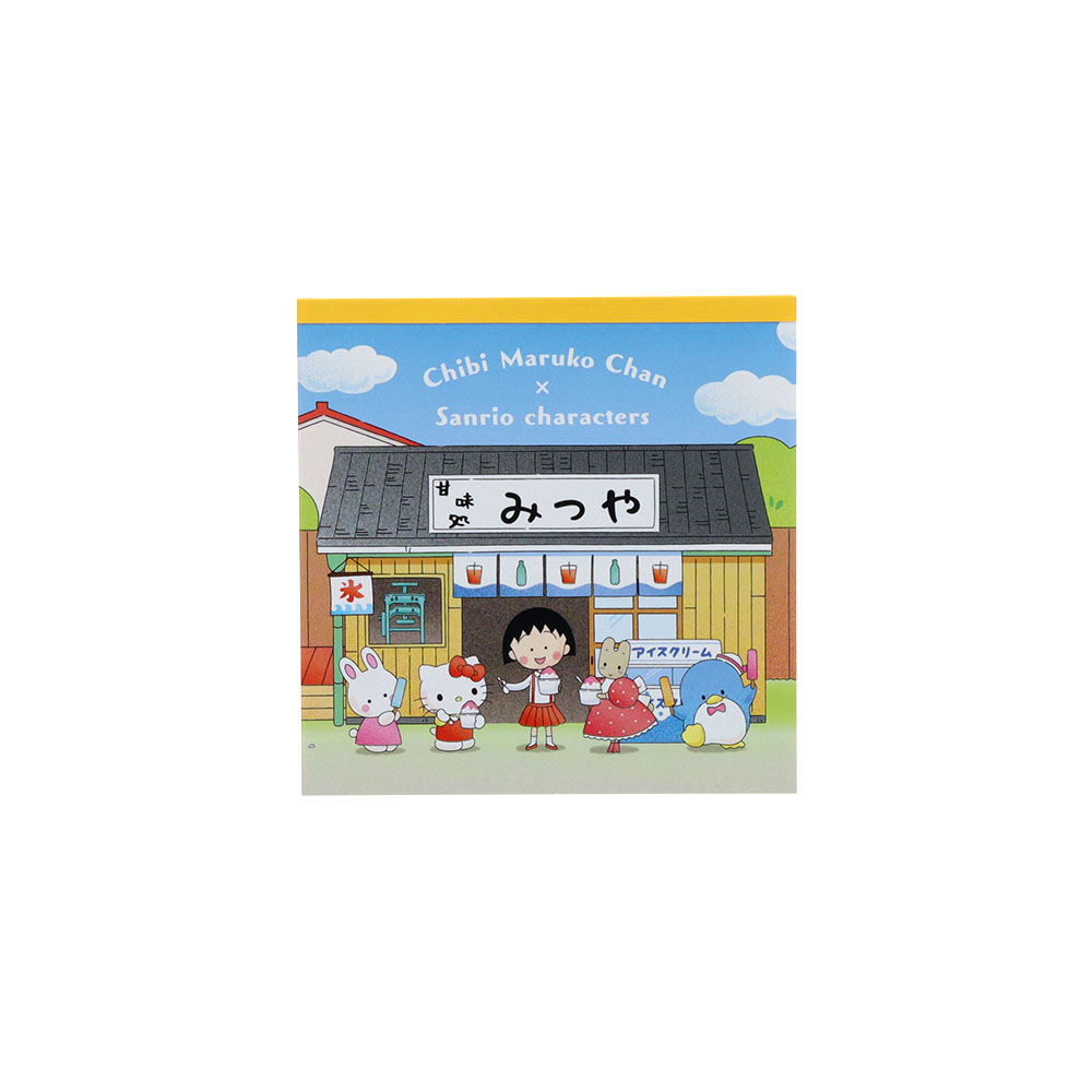 表紙には『ちびまる子ちゃん』でお馴染みの駄菓子屋”みつや”の前でアイスを食べる「まる子」と「ハローキティ」「チアリーチャム」「マロンクリーム」「タキシードサム」がデザインされています。