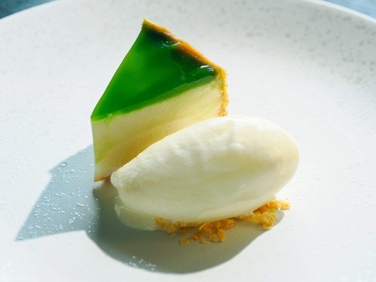 タルト生地は香ばしく焼き上げ、ピスタチオクリームと白バラ香るフロマージュブランが重ねてあります。