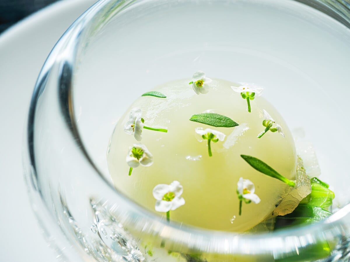 続いて、エルダーフラワーやアスパラガスの華やかな香りをまとわせた料理や、うるいの青々しくほろ苦い春のニュアンスを添えた一皿がコースの幕開けを軽やかに彩ります。