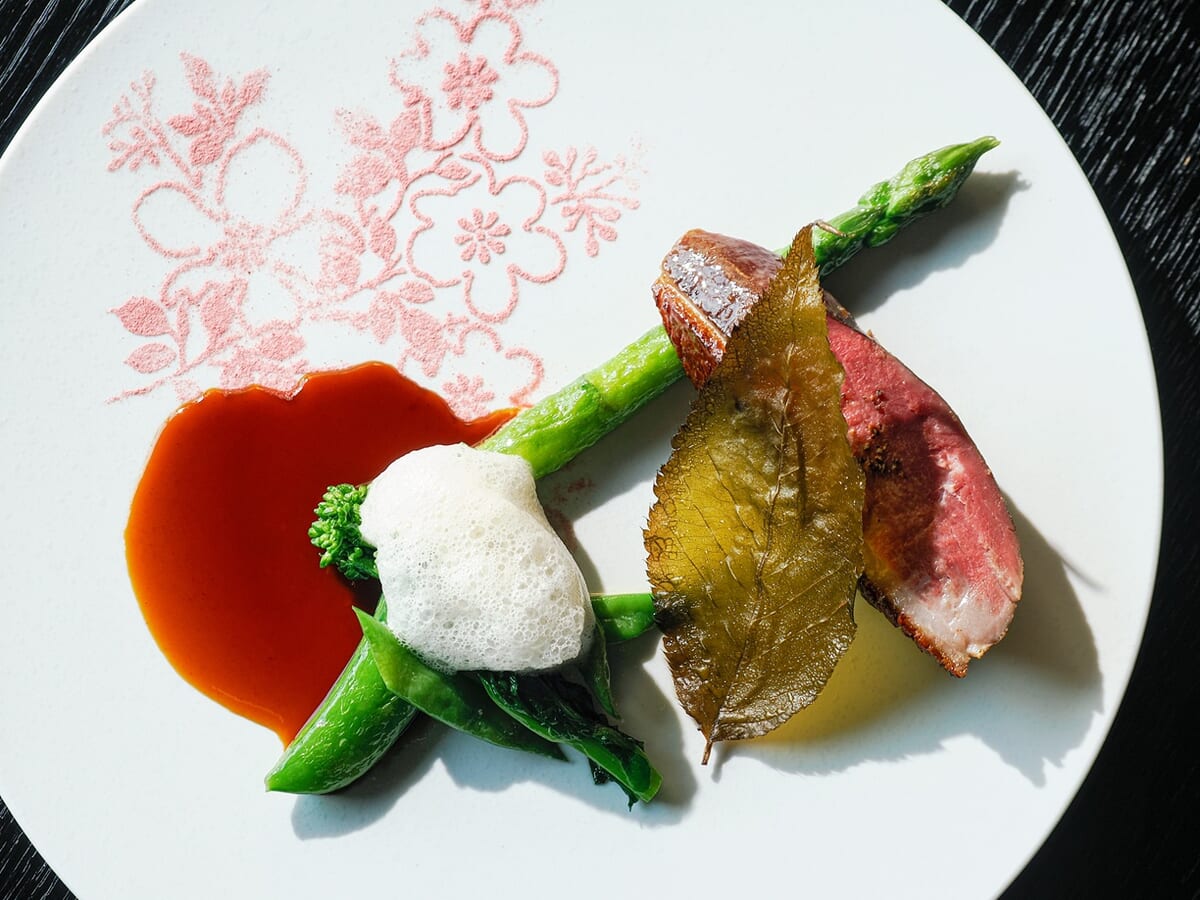 肉料理「野田鴨のロースト 桜の芳香」は、野田鴨の胸肉を桜の枝で燻し、桜の香りをやわらかく纏わせた一皿。