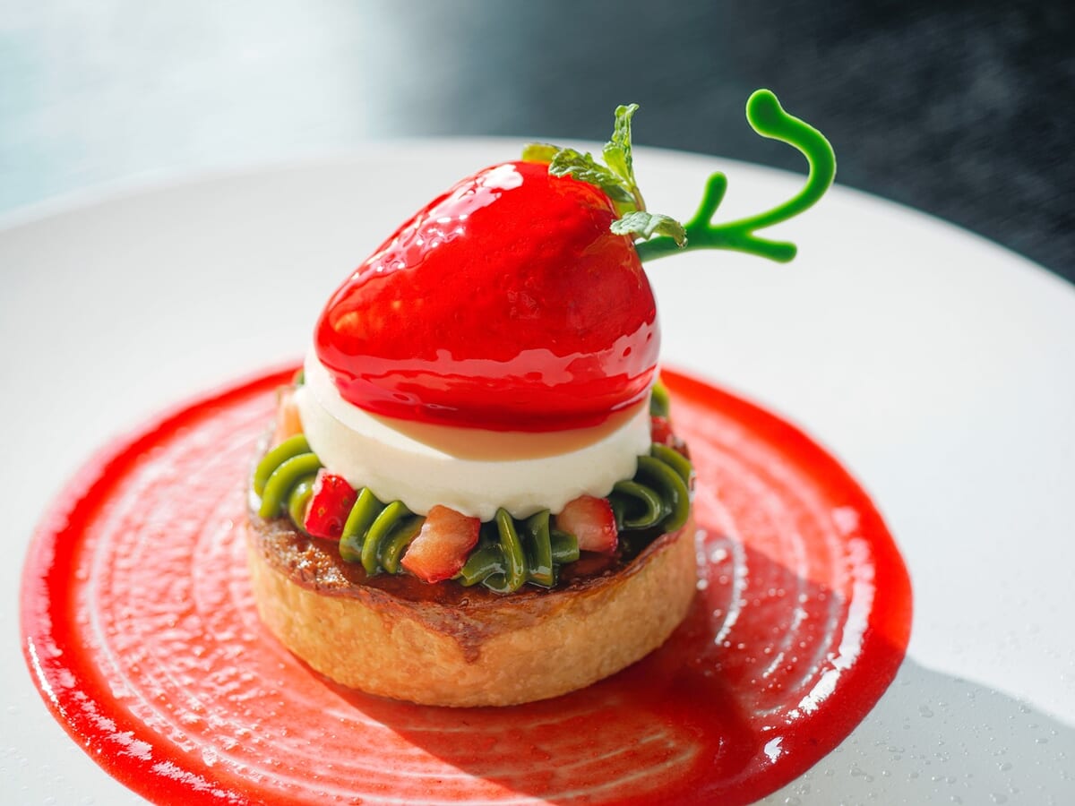 トップに苺を模した愛らしいムースがあしらわれた、春の庭園を思わせる一皿。