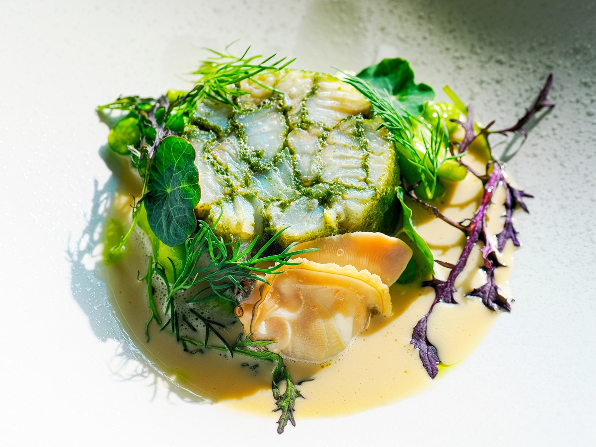 魚料理は、海藻を纏わせた鮎魚女をロンデル型に成形し、低温でしっとりと火入れした一皿。