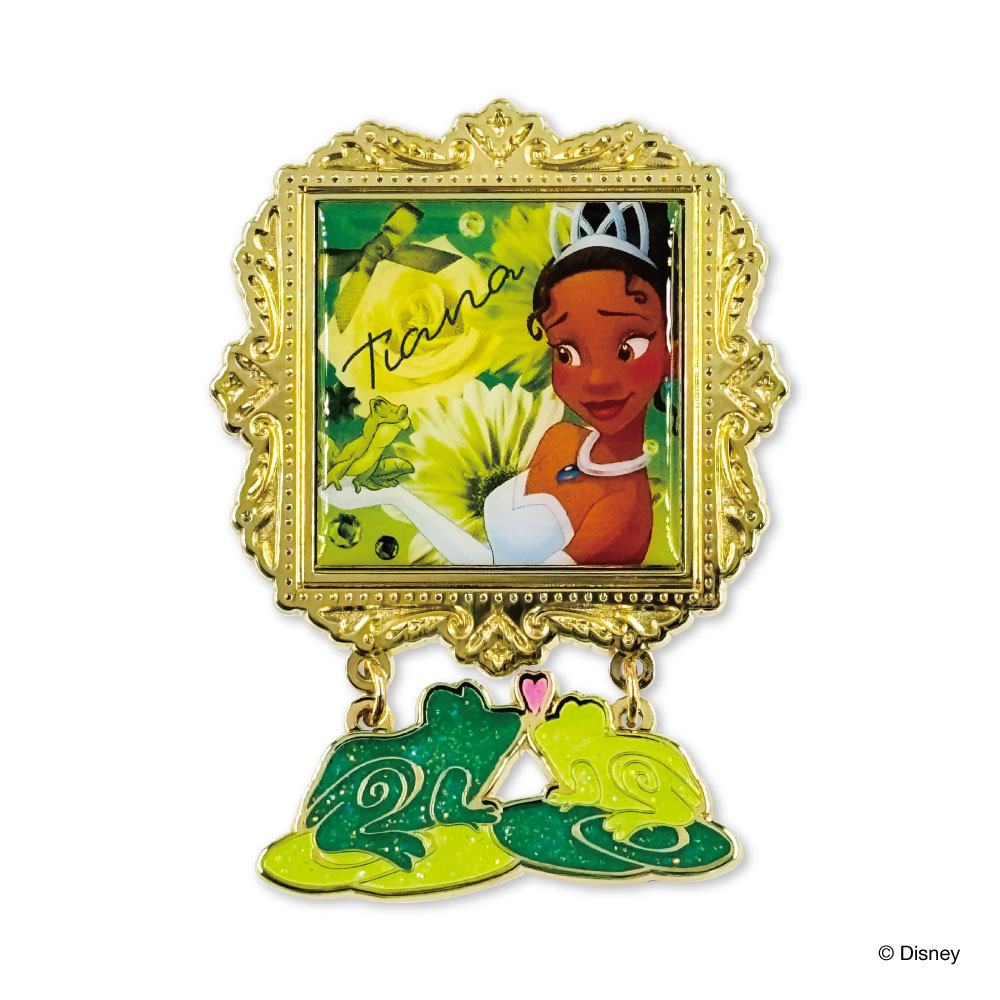 ディズニーのプリンセス「ティアナ」と、カエルになった「ナヴィーン王子」が描かれた、カエルをモチーフにしたチャームがゆらゆら揺れる仕様になった『プリンセスと魔法のキス』デザイン。