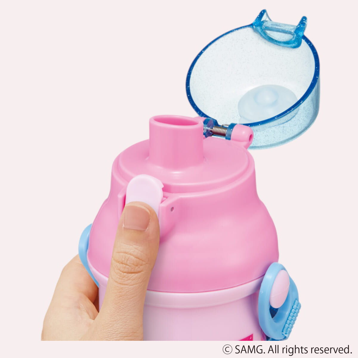 ボタンを押すだけで簡単にフタが開く、直飲みタイプの水筒。