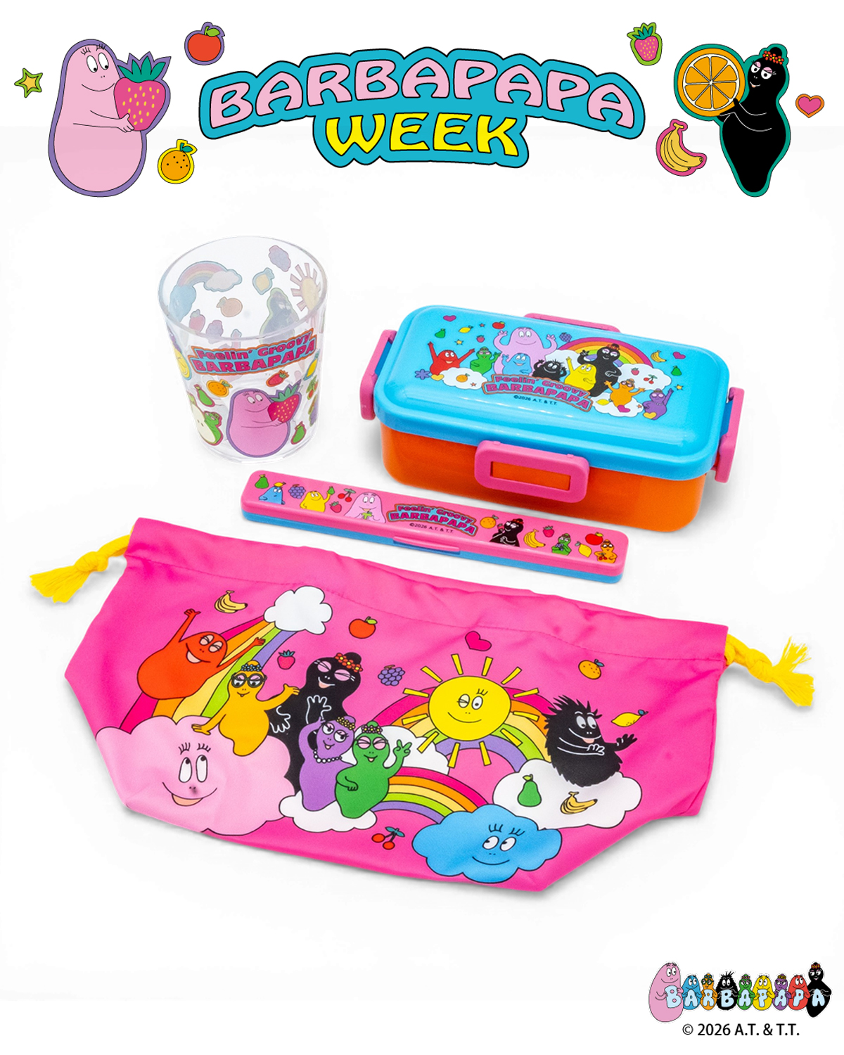 「バーバパパファミリー」とフルーツが描かれた、 お弁当作りが楽しくなる、機能性にもこだわったランチグッズ。