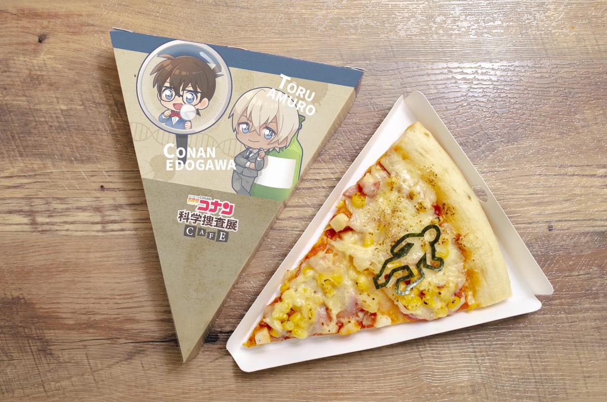 被害者のシルエット型のカット海苔がのった、犯行現場をイメージしたマヨコーンピザ。