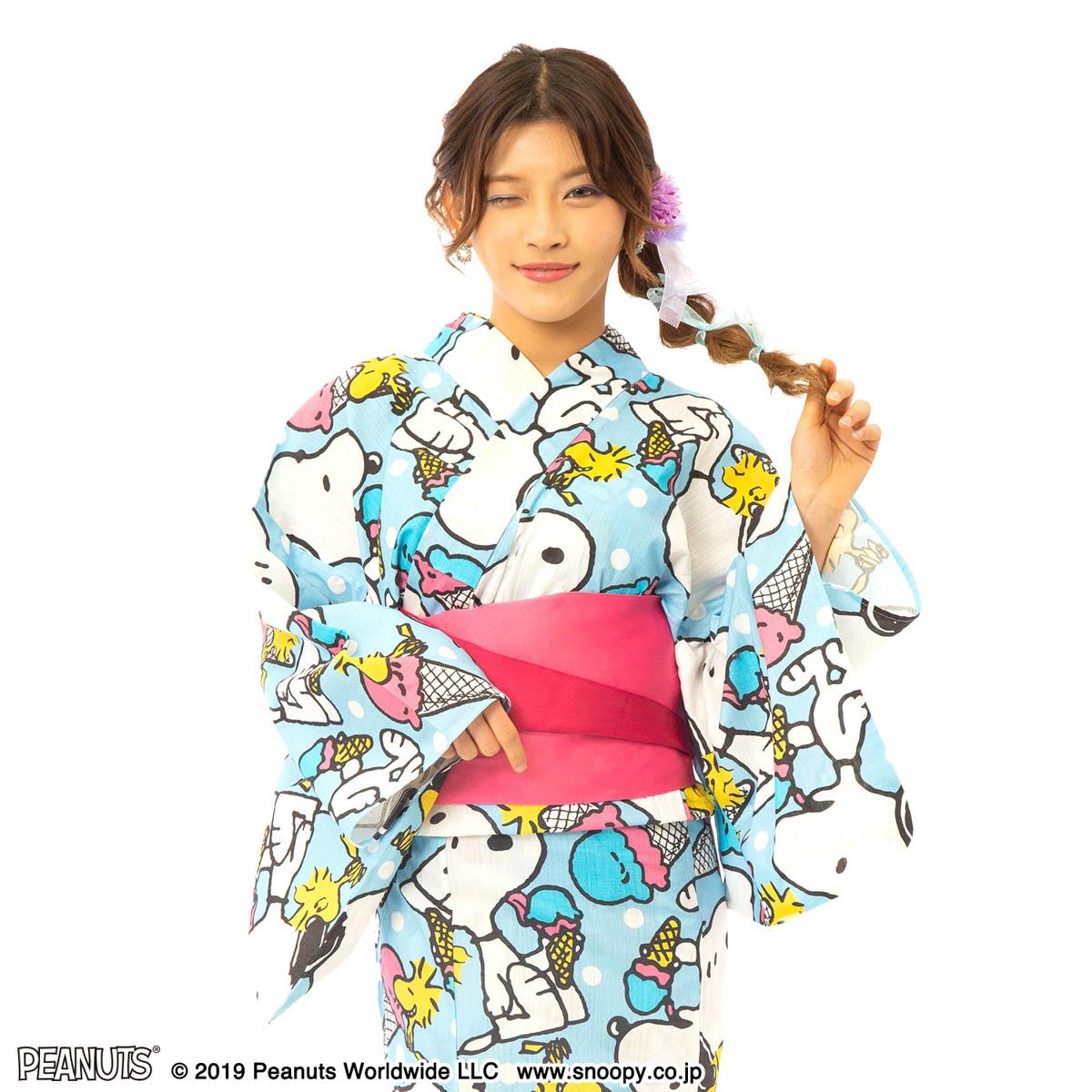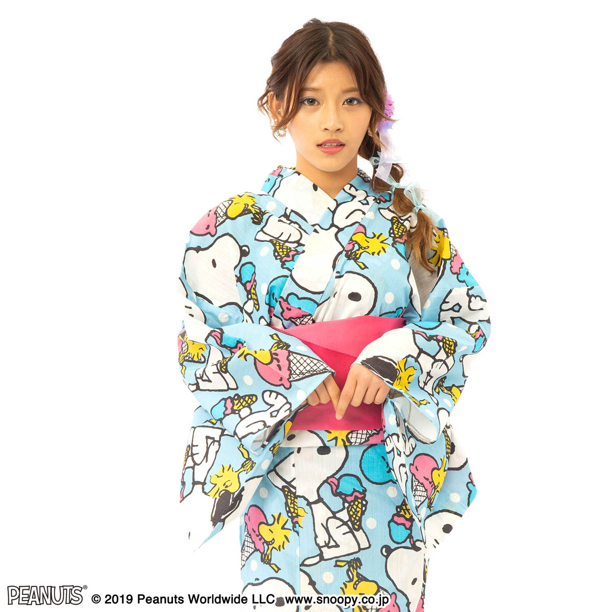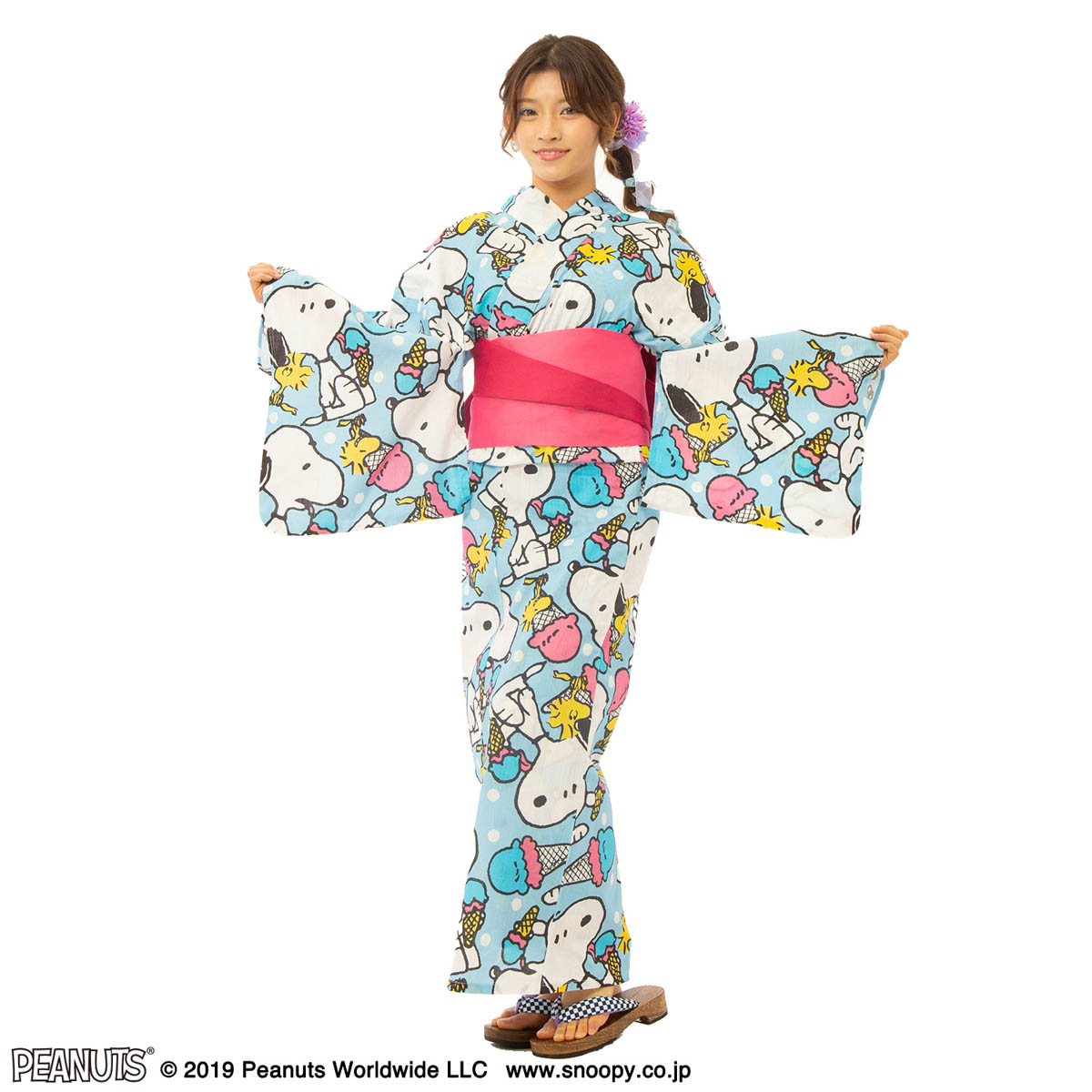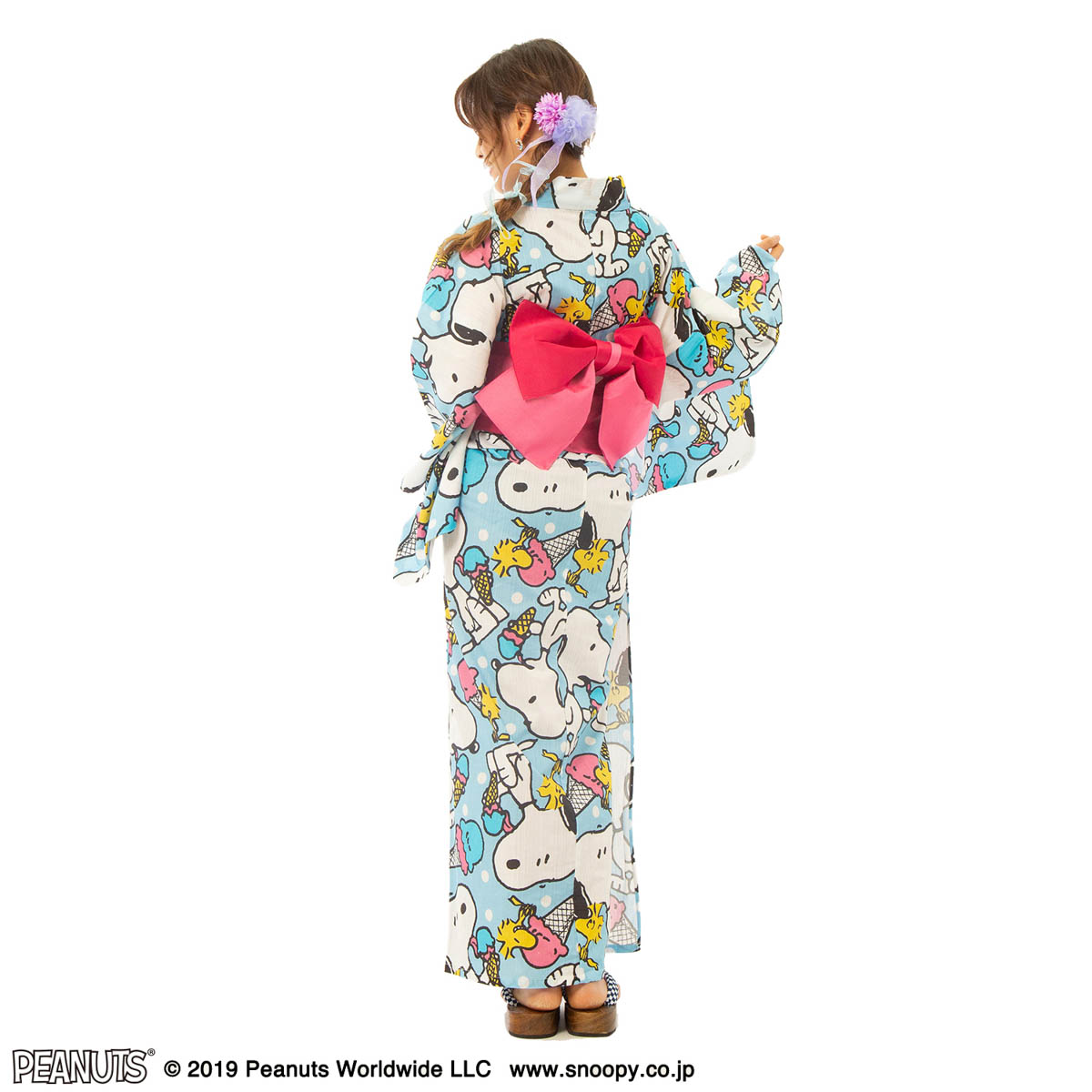「スヌーピー」と「ウッドストック」がデザインされた浴衣。