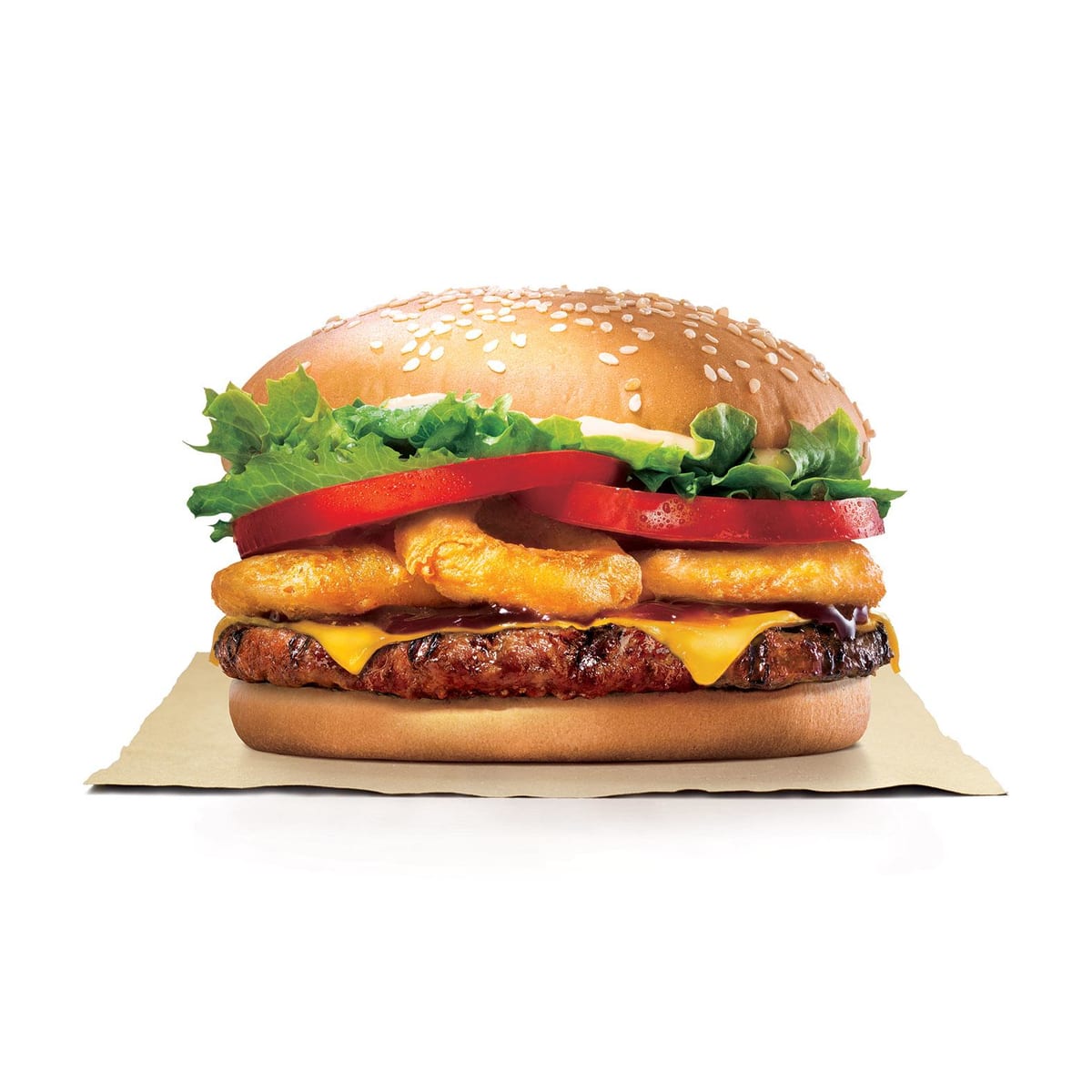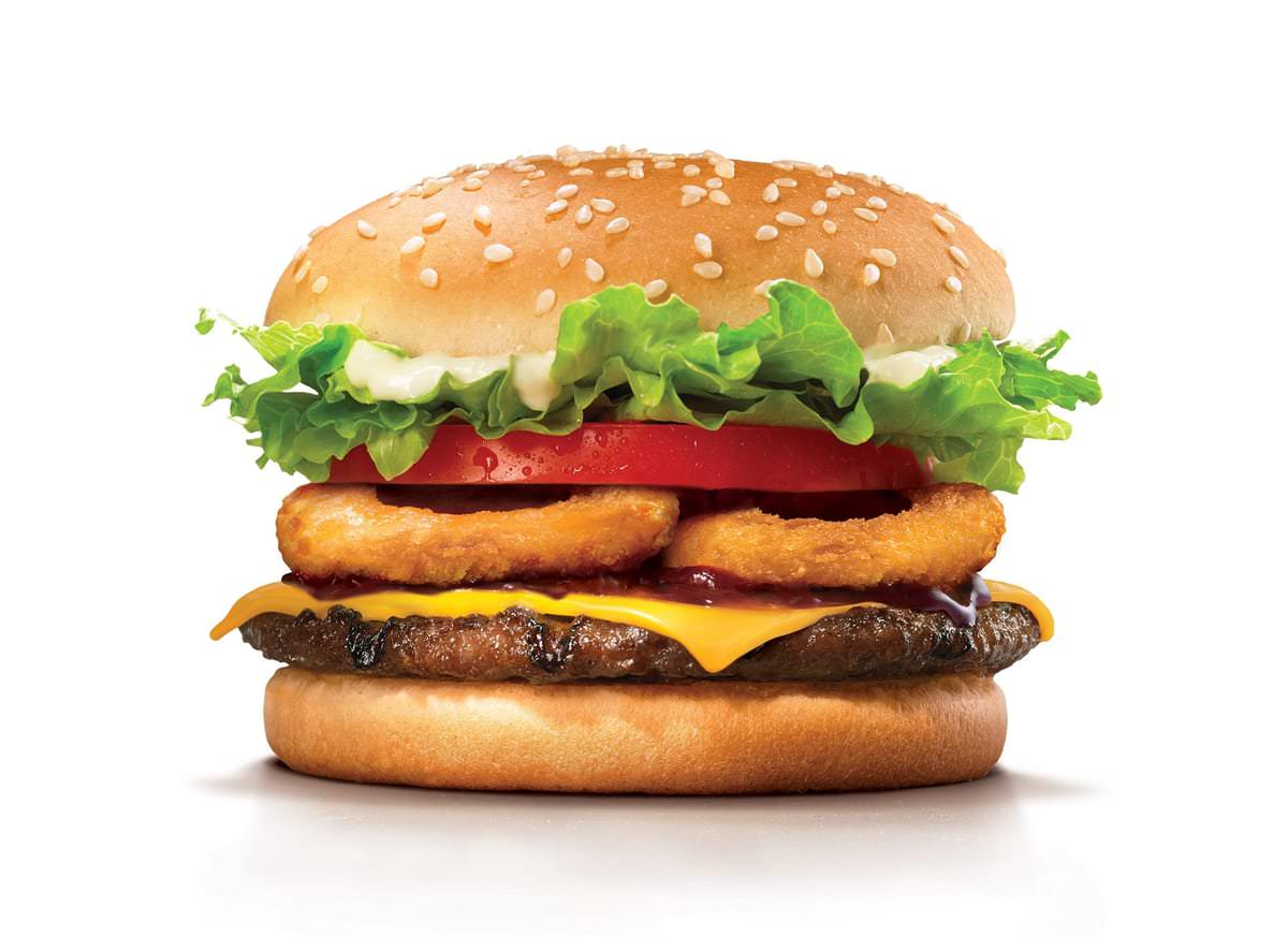 バーガーキング自慢の直火焼き100%ビーフパティと、サクサクとした歯ざわりのオニオンリング、そしてコクのあるチェダーチーズとシャキシャキの野菜をサンドし、スモーキーな味わいのBBQソースで仕上げた満足感のあるバーガーです。