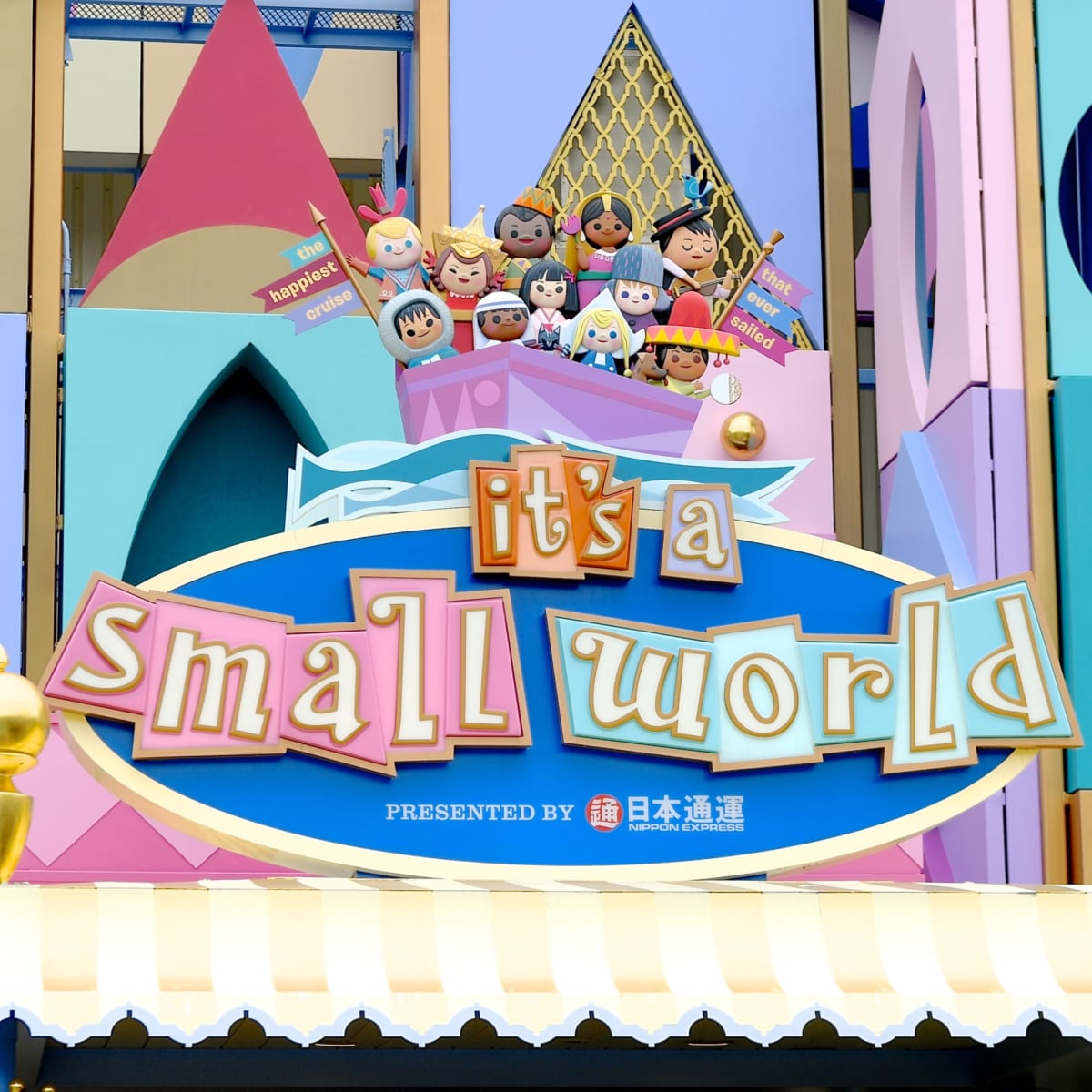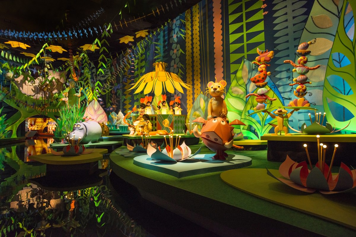 世界中の子供たちが各国の民族衣装で歌う名曲「小さな世界」を聞きながら、ボートはヨーロッパからアジア、アフリカ、中南米、南太平洋の島々へと世界一周の幸福な旅をおくります。