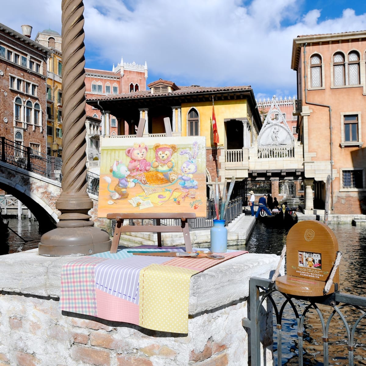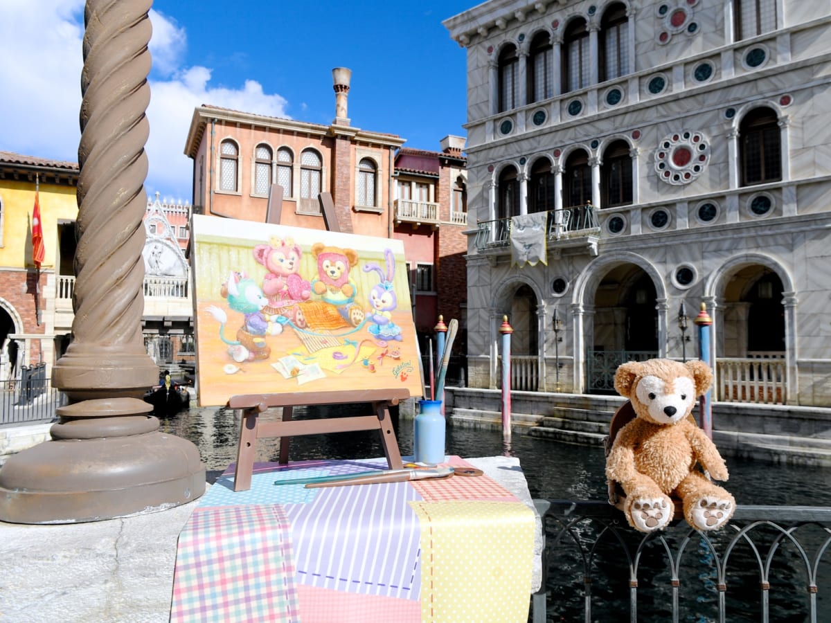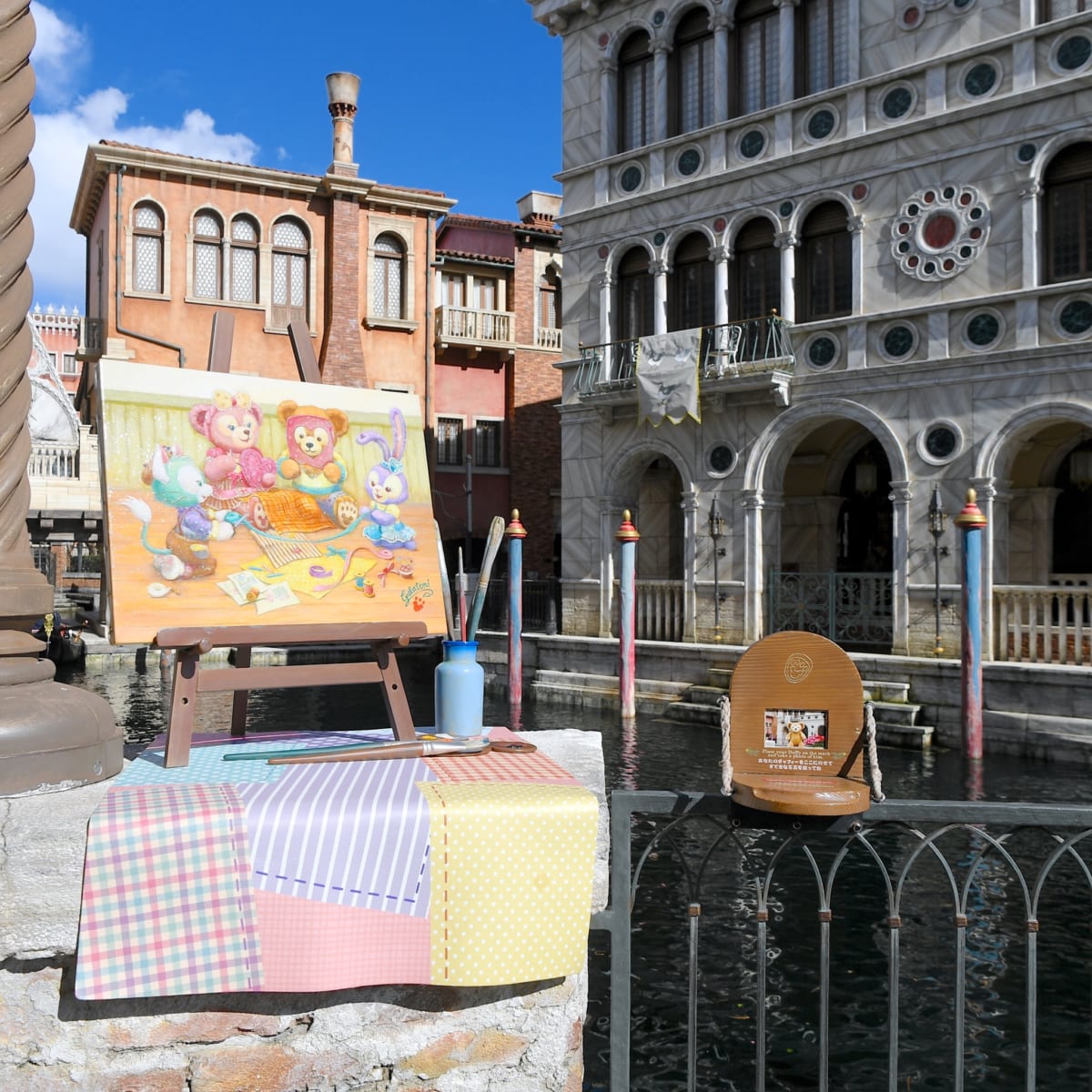 イーゼルの前にダッフィーたちを座らせて写真を撮ることも。