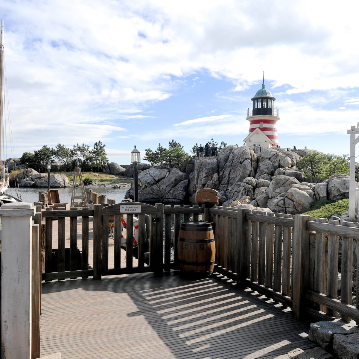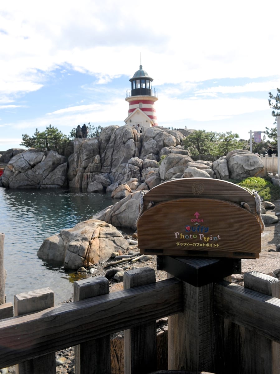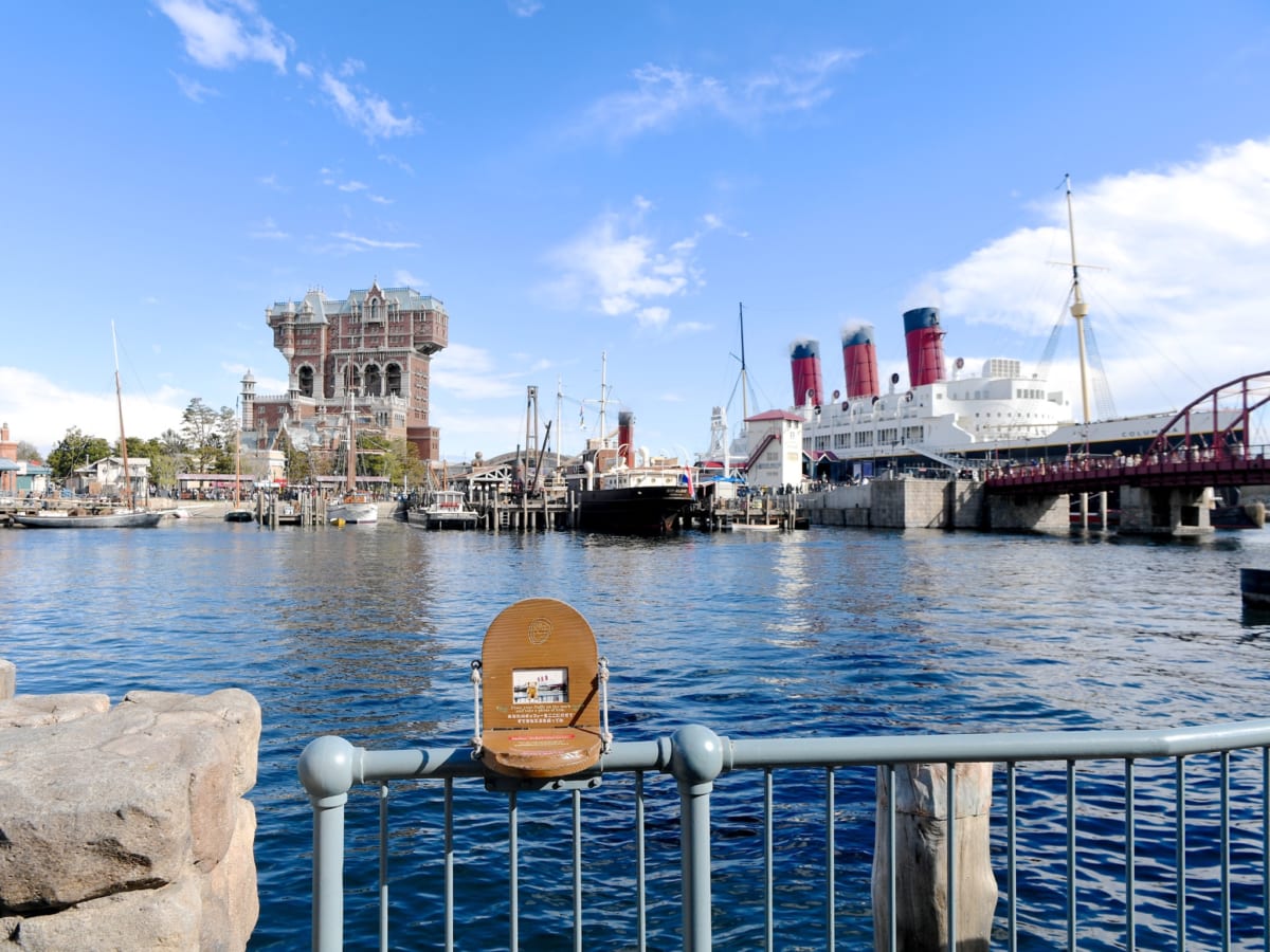 後ろの海は「ディズニーシー・トランジットスチーマーライン」の通り道でもあるので、タイミングがあえば一緒に写真に写すことができます☆