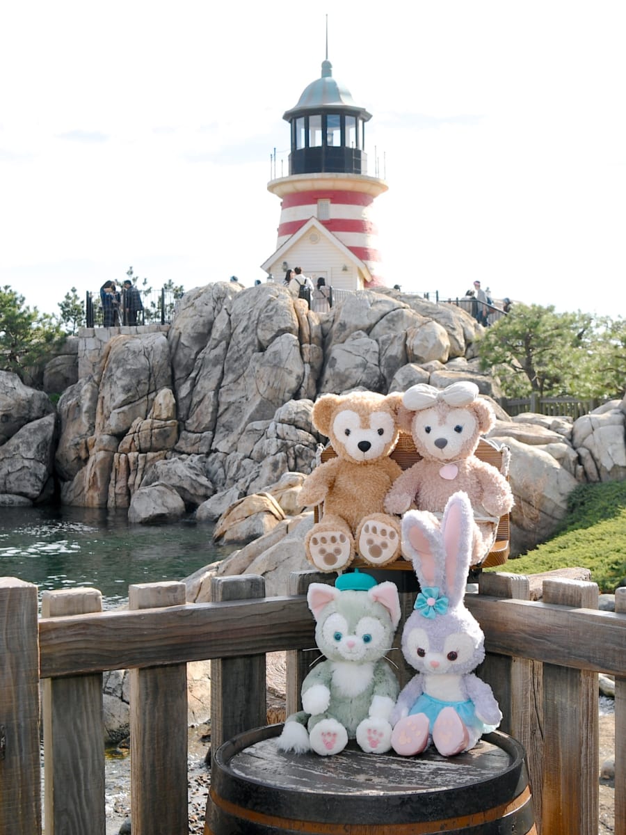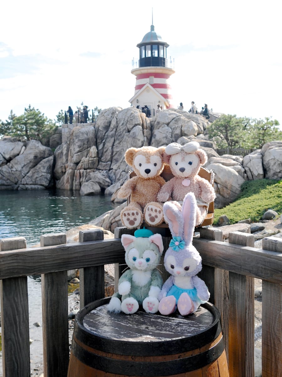 フォトポイントの前にある樽の上にぬいぐるみを置けば、ダッフィー&フレンズを勢ぞろいさせることもできます!