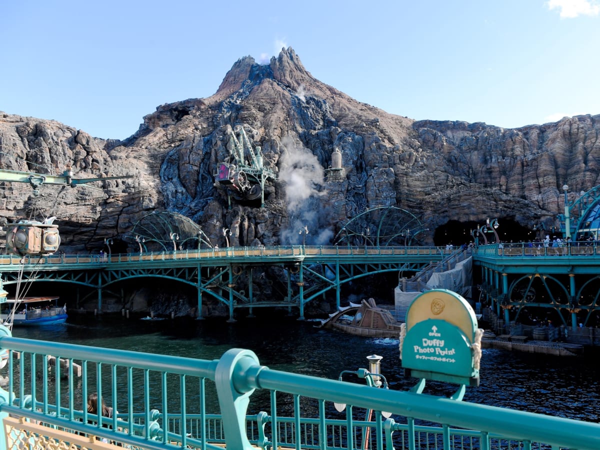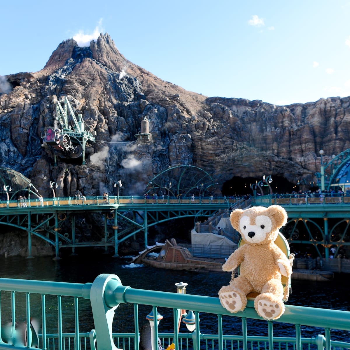 ミステリアスアイランドでは、プロメテウス火山を背景にダッフィーたちの写真を撮ることができます☆