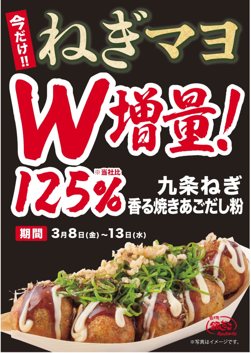 さまざまなトッピングたこ焼きが人気の「築地銀だこ」で、大人気商品『ねぎマヨ』の"九条ネギと焼きあごだし粉"が125%増量になるキャンペーンを開催!