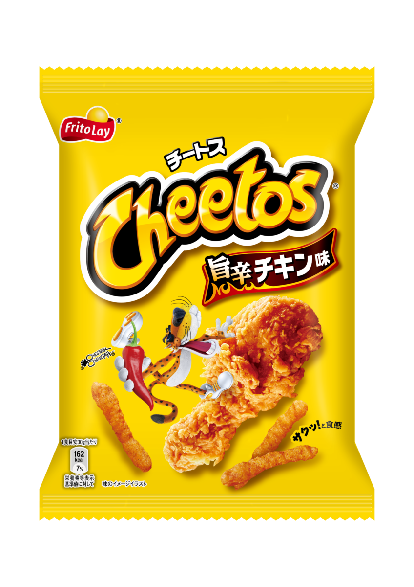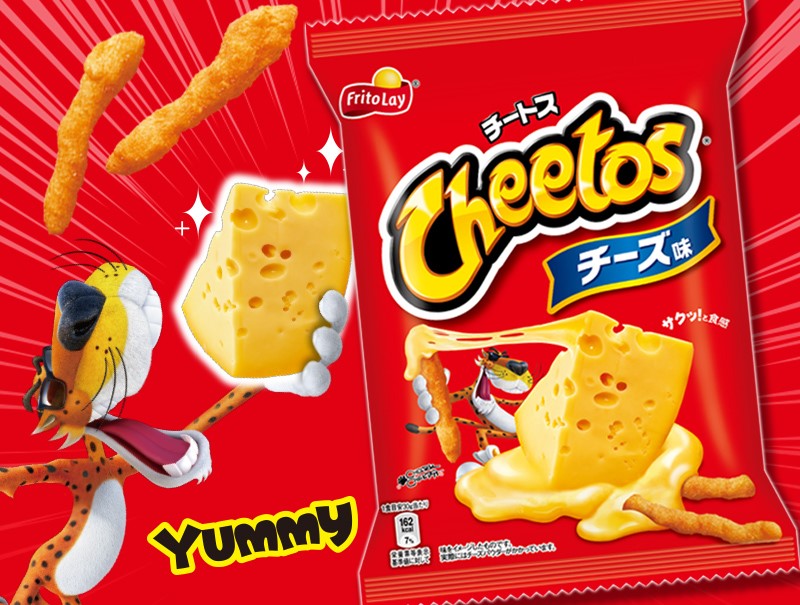 Chee(チーズ)+tos(小さい)=Cheetos(チートス)が名前の由来となっており、ミニチーズをイメージした濃厚な味、そしてサクッとした食感が世界中で愛されています。