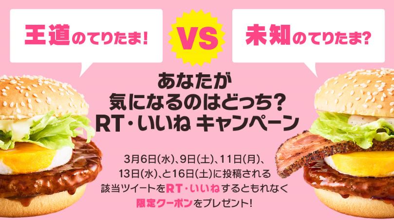 内容:マクドナルド公式Twitter アカウント(@McDonaldsJapan)をフォローし、同アカウントに投稿されたキャンペーン対象のツイート「#春の出会いをかみしめて」かつ「#どっちのてりたま」がついた投稿を公式「リツイート」または「いいね」すると、@Love_McD より、割引クーポンが@返信で届きます。3月6日(水)、9日(土)、11 日(月)、13日(水)、16日(土)、計5回参加可能です。