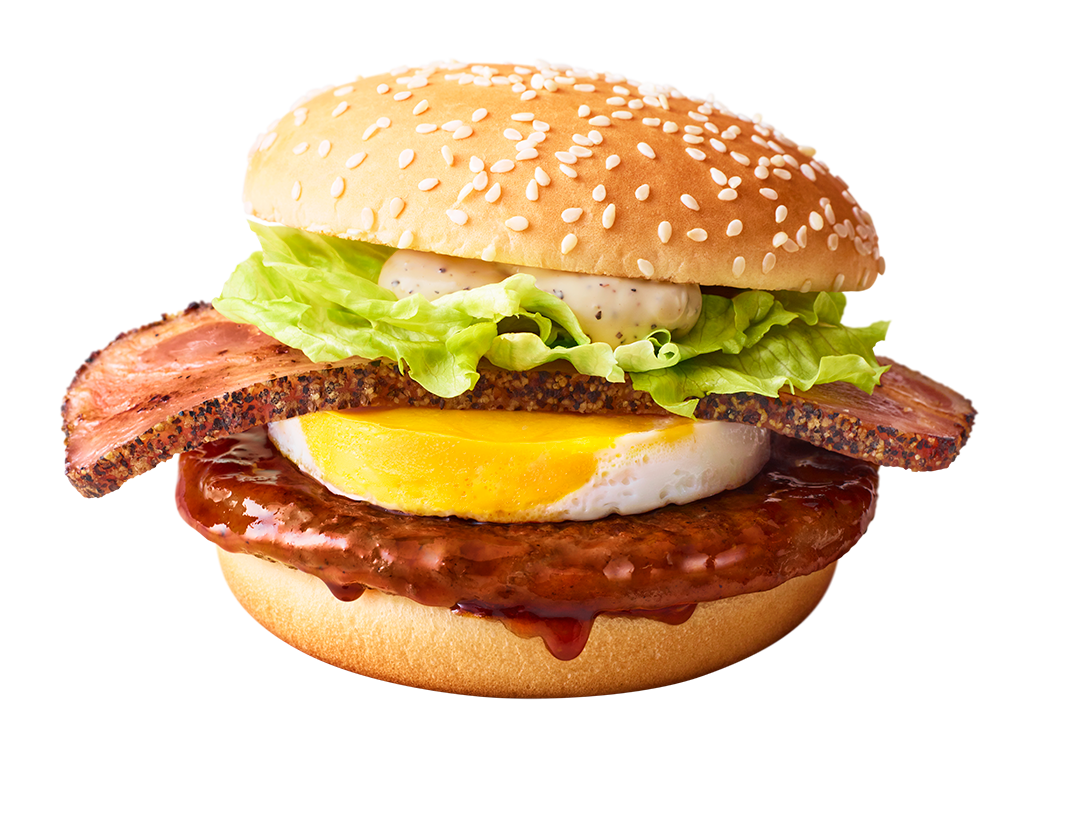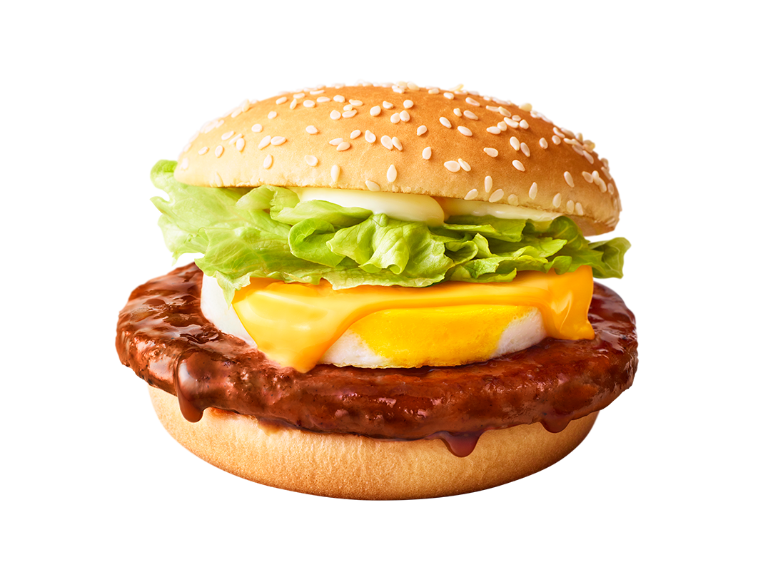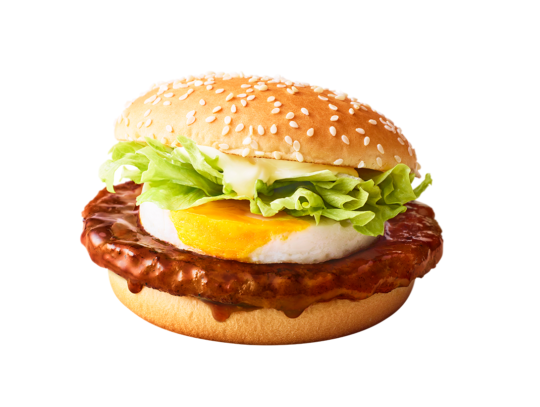旨みに富んだポークパティにてりやきソースを絡め、ぷるぷるたまご、シャキシャキレタス、スイートレモンソースを加え、香ばしいゴマ付きバンズでサンド!