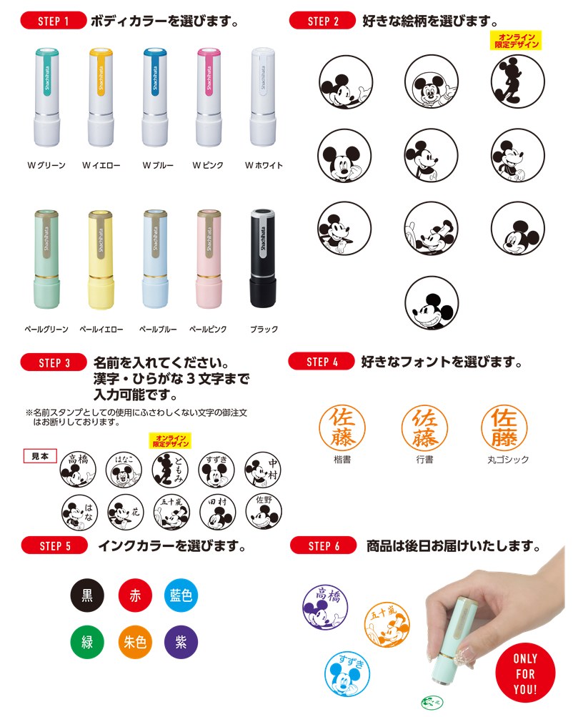 スタンプのボディ、絵柄、フォント、インクの色を選び、好きな名前でスタンプが作れる、世界に一つだけ、自分だけのミッキーマウススタンプ(シヤチハタ)。