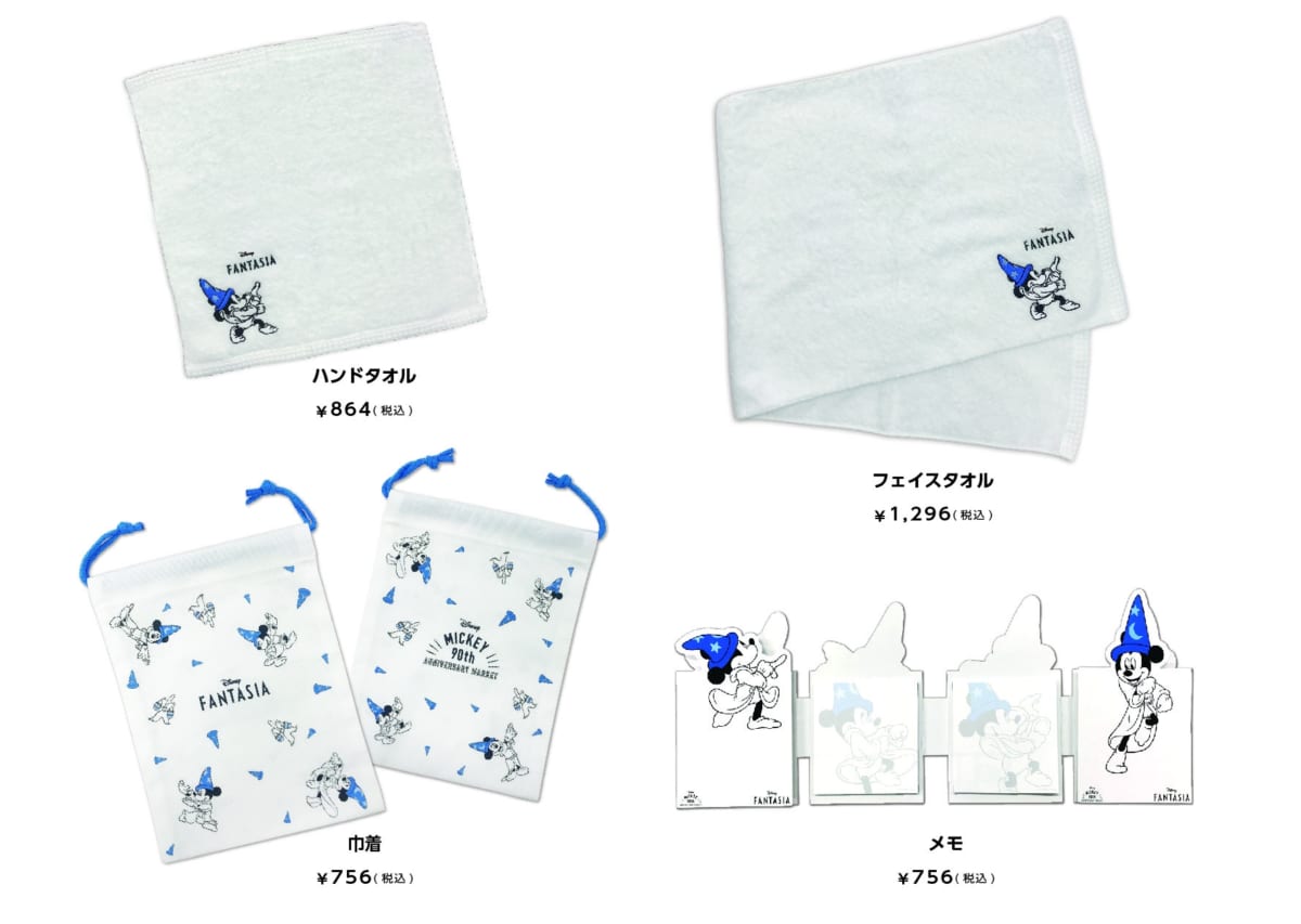 価格:ハンドタオル864円(税込)、フェイスタオル1,296円(税込)、巾着756円(税込)、メモ756円(税込)